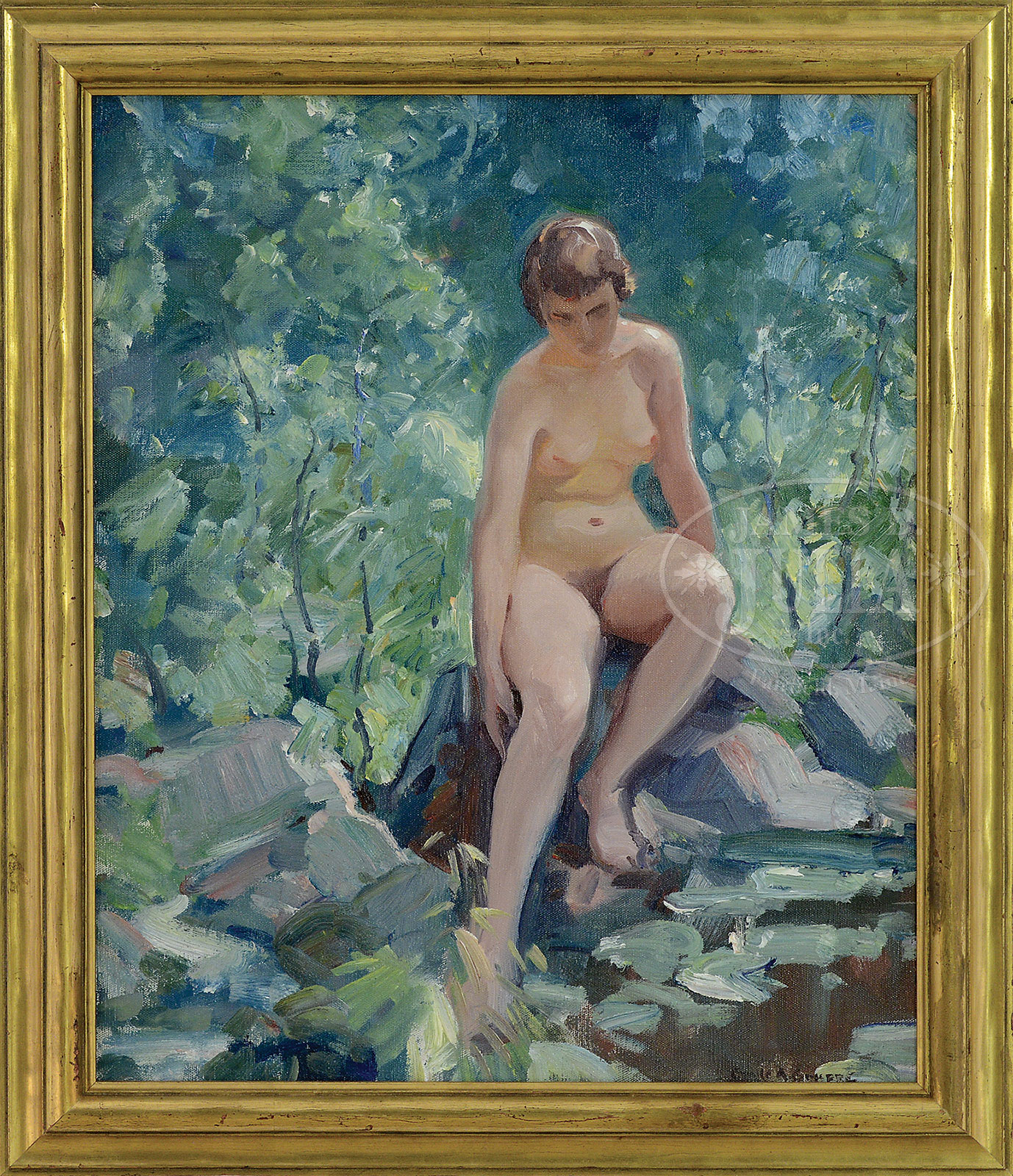 EMILE ALBERT GRUPPE (American, 1896-1978) “WOMAN BY THE STREAM”.Oil on canvas Housed in a good gilt molded wood frame Signed lower right “Emile A Gruppe”, On verso is a Rockport Art Association exhibit label October 5- November 23, 2008 “Emile Gruppe Retrospective”, also a Spanierman Gallery label. SIZE: 24″ x 20″. Overall: 28″ x 24″ CONDITION: Very good 51911-42 (5,000-8,000) – Lot 1094
