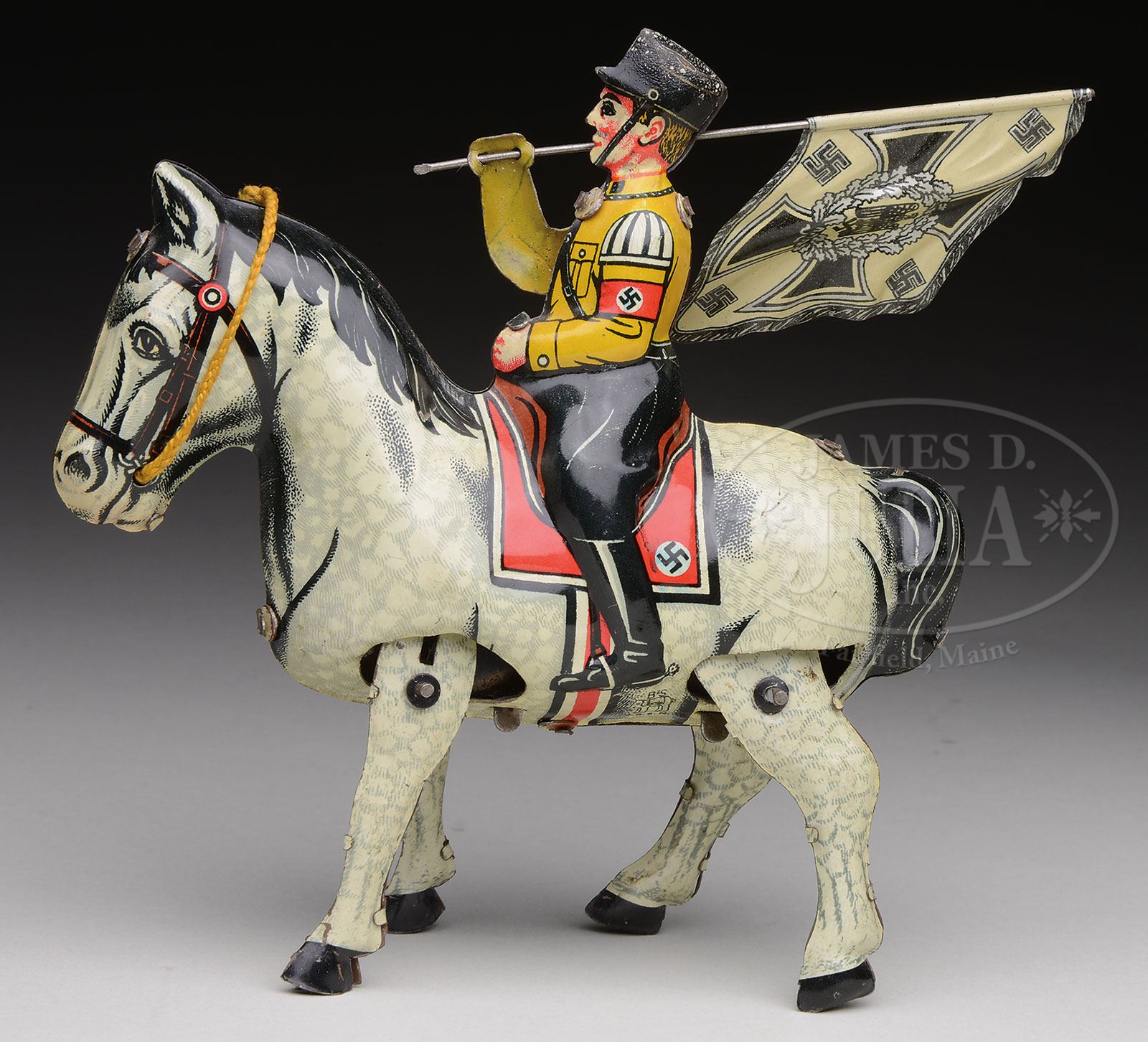 An interesting toy, most likely from the 1930s-early 1940s era by B&S (attributed to Blomer & Schuler). The military figure emblazoned with the swastika armband as well as swastikas on his saddle is riding astride a horse in parade outfit carrying the Nazi flag. A finely lithographed toy, the horse being a dapple finish. Toy is marked “B&S” with the elephant trademark directly under rider’s left foot. The litho is in outstanding, vibrant wonderful condition with minimum minor wear at arm area and rear of seated figure. An interesting and rare toy that is seldom seen and obviously not necessarily appealing to most toy collectors. SIZE: Overall: 5-1/4″ l. PROVENANCE: The Estate of Carol and Jerry Soling. CONDITION: Very good and working, with key. 1-14734 (400-600) – Lot 1095