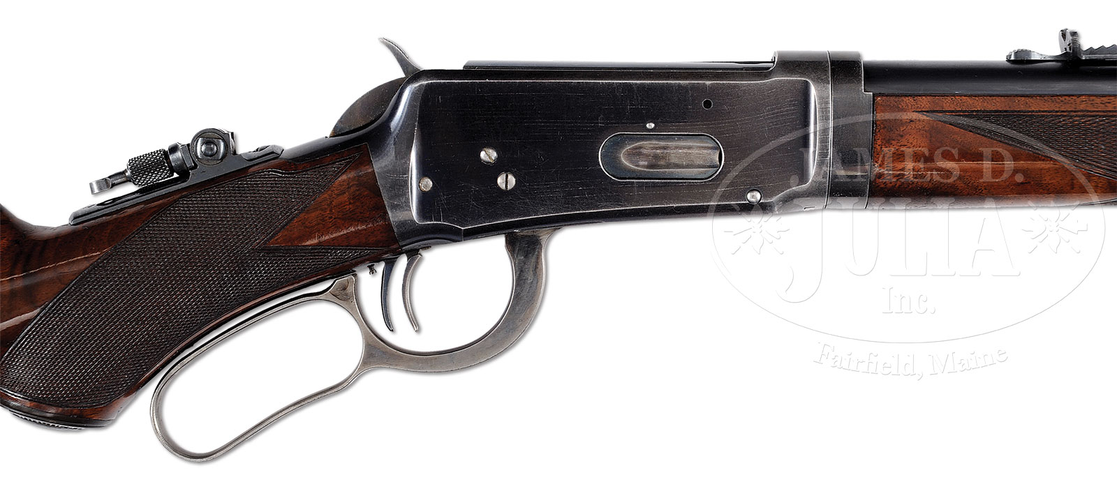 STUNNING WINCHESTER MODEL 94 DELUXE TAKE DOWN LEVER ACTION RIFLE.SN 19673. Cal. 30 WCF. 26″ rnd bbl, full mag take down, Lyman gold bead front sight, serrated side sporting rear with set screw. Top of bbl marked “MANUFACTURED BY THE/WINCHESTER REPEATING ARMS CO.NEW HAVEN.CONN.U.S.A.”,adjacent take down ring “30W.C.F.” Standard receiver with close coupled dbl set triggers, tang mounted lockable peep sight. Mounted with “XXX” quality walnut, checkered pistol grip, Winchester hard rubber grip cap, crescent steel buttplate, sling eye, 3″ from toe with hook swivel, “H” style checkered forend, nosecap with sling eye, hook swivel, and vintage adjustable strap. Inspection of lower tang reveals Assembly No. 3631XXX, this matching No. can be found in back of stock, and inside toe of buttplate. Accompanied with Cody Firearms Museum Fact sheet, identifying as 30 cal. rifle, rnd bbl, set triggers, checkered pistol grip stock, Lyman front and blank in rear seat, received in warehouse August 16, 1897, shipped from warehouse August 16, 1897 on Order No. 12545. CONDITION: Very fine. Bbl and mag tube retain 95-97% orig blue, with minor muzzle wear, typical minor nicks & dings, faint rub mark on mag tube from take down. Receiver retains 90% orig blue, thinning across bottom and sharp edges, a few minor handling marks, and shows the orig filing marks. Stock is sound with minor nicks & dings, typical handling marks and retains most of its deluxe factory finish. Buttplate shows thinning orig case colors, blending with silver patina. Forend is sound, with good checkering, minor nicks & dings and light scratches, and retains most of it fine deluxe factory finish. Mechanics are crisp with a nice shiny bore. 51579-1 (10,000-15,000) – Lot 1096