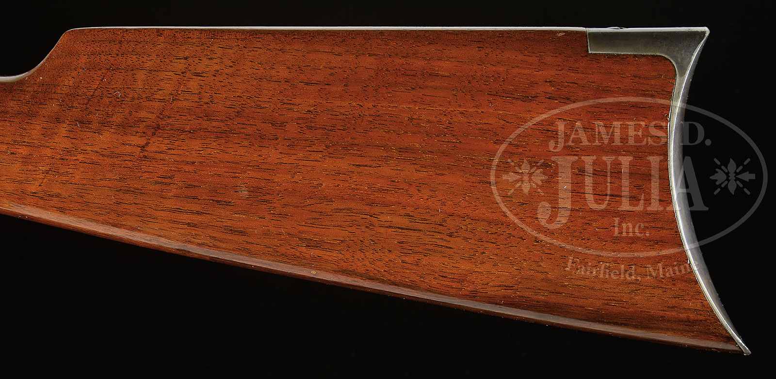 SPECIAL ORDER WINCHESTER MODEL 1894 TAKE DOWN LEVER ACTION RIFLE.SN 22999. Call 32-40. Antique standard grade ’94 with 26″ oct bbl, full magazine with combination front sight, semi-buckhorn rear sight and Lyman tang sight with large disc aperture. Receiver has close-coupled double-set triggers. Mounted with nicely figured, extra finish, uncheckered American walnut with straight stock & crescent buttplate. Accompanied by a full box of Winchester 32-40 ammunition. Box is 1-pc, red, blue & yellow with cartridges that have 165 grain soft point bullets. This rifle was produced in about 1895 when carrying and using a rifle was a daily way of life for most citizens. It is very likely that this rifle was someone’s prized hunting gun which saw limited service. CONDITION: Very fine. Bbl & magazine tube retain 97-98% crisp orig blue with a small ding and fine rub on the bbl. Receiver retains 96-97% crisp orig blue with slight sharp edge wear and a few small nicks & scratches. The take down bbl extension retains about 60% orig blue with the losses from flaking. Lever & hammer retain strong case colors, bright on sides of the lever and in sheltered areas. Buttplate retains about all of its orig case colors, moderately faded. Wood is sound and shows about all of an old restored finish. Mechanics are crisp, brilliant shiny bore, has been fired but very little. Box shows edge wear and reattached end flaps otherwise shows light soil. Ammunition is crisp & clean. 51570-7 JRL (4,000-7,000) – Lot 1099