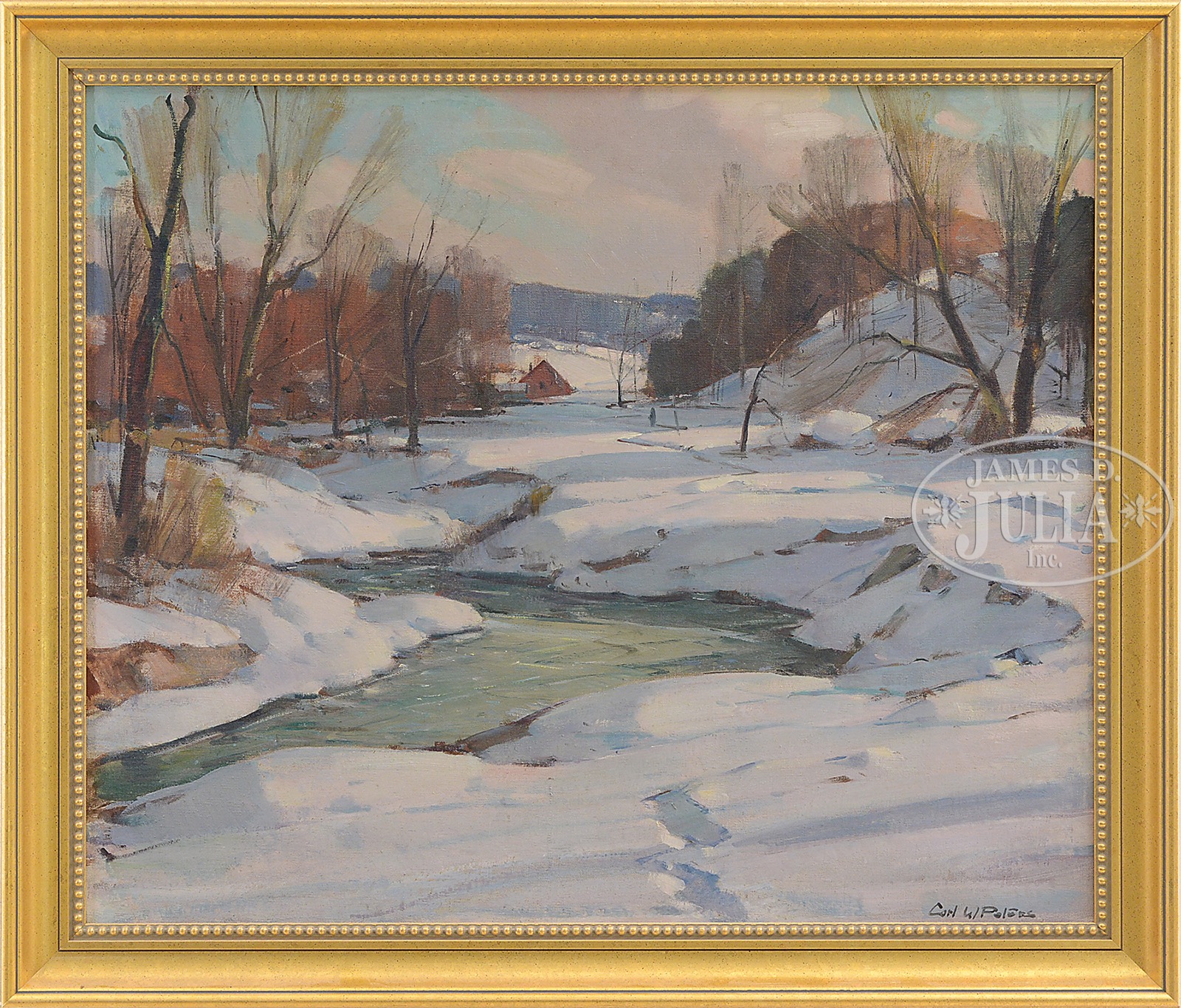 CARL W PETERS (American, 1897-1980) WINTER BROOK, NEW YORK.Oil on canvas Housed in a modern giltwood frame Signed lower right “Carl W. Peters” SIZE: 25″ x 30″. Overall 29-1/2″ x 34-1/2″ PROVENANCE: Acquired directly from the artist CONDITION: Very good with minor surface dirt 51208-7 (2,000-4,000) – Lot 1099