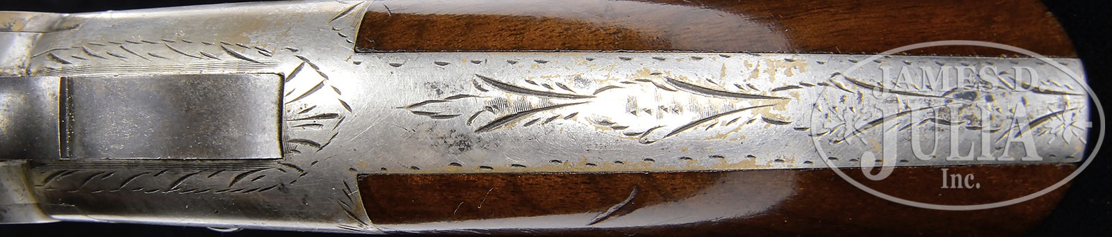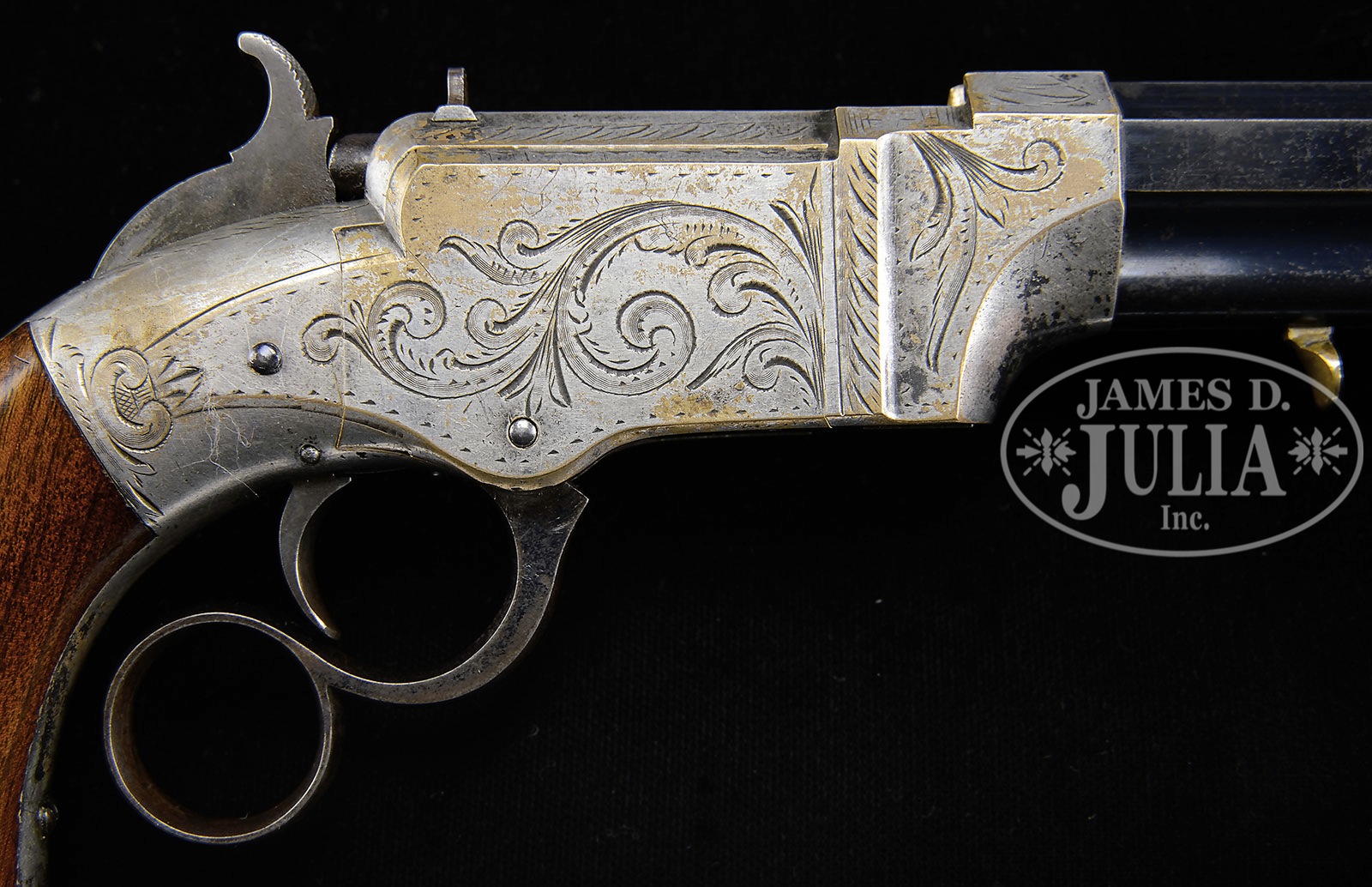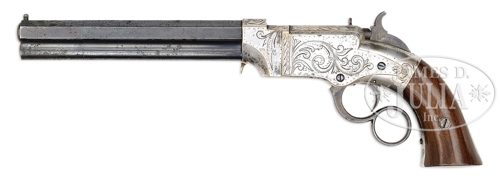 RARE NEW HAVEN ARMS NO. 1 POCKET MODEL TARGET VOLCANIC LEVER ACTION PISTOL.SN 1661. Cal. 31. Blue & silver finish with rare 6-3/8″ oct bbl that has integral magazine and pinched post front sight, with fixed rear sight in the top flat of the frame. Top flat of bbl has the New Haven address and Feb. 14, 1854 patent date Frame is silver plated gun metal (bronze) with typical sparse factory engraving consisting of shaded foliate arabesque patterns which extend over the top of the frame, around the hammer slot and down the back strap. Mounted with 2-pc smooth walnut grips matching numbered to this pistol. SN is on the left side of the butt strap and inside each grip. No additional disassembly was effected to check for other matching numbers. According to Flayderman’s Guide to Antique American Firearms There were only about 225 No. 1 pistols produced with 6″ bbl. Of these 225 guns produced in this barrel length, few could have survived in such high condition. Our company has sold several of the finest Volcanic collections in past ten years and only had two examples in 6”(SN 502, 553), and neither close to this condition. While these pistols are occasionally encountered they are rarely ever found plated & engraved with any appreciable amount of orig finish. CONDITION: Very fine. Bbl & magazine retain 75-80% glossy orig blue with light surface rust; receiver, sideplates, front & back straps retain 88-90% strong orig silver with sharp, clean edges; hammer retains dark case colors and the lever 50-60% orig blue turning brown. Grips show light edge wear with some minor dings on the bottom edges and overall retain about 97-98% crisp orig varnish. Mechanics are fine, strong bright bore with pitting in the grooves. An exceptionally rare, high condition Volcanic. 8-76377 JR167 (20,000-30,000) – Lot 1100