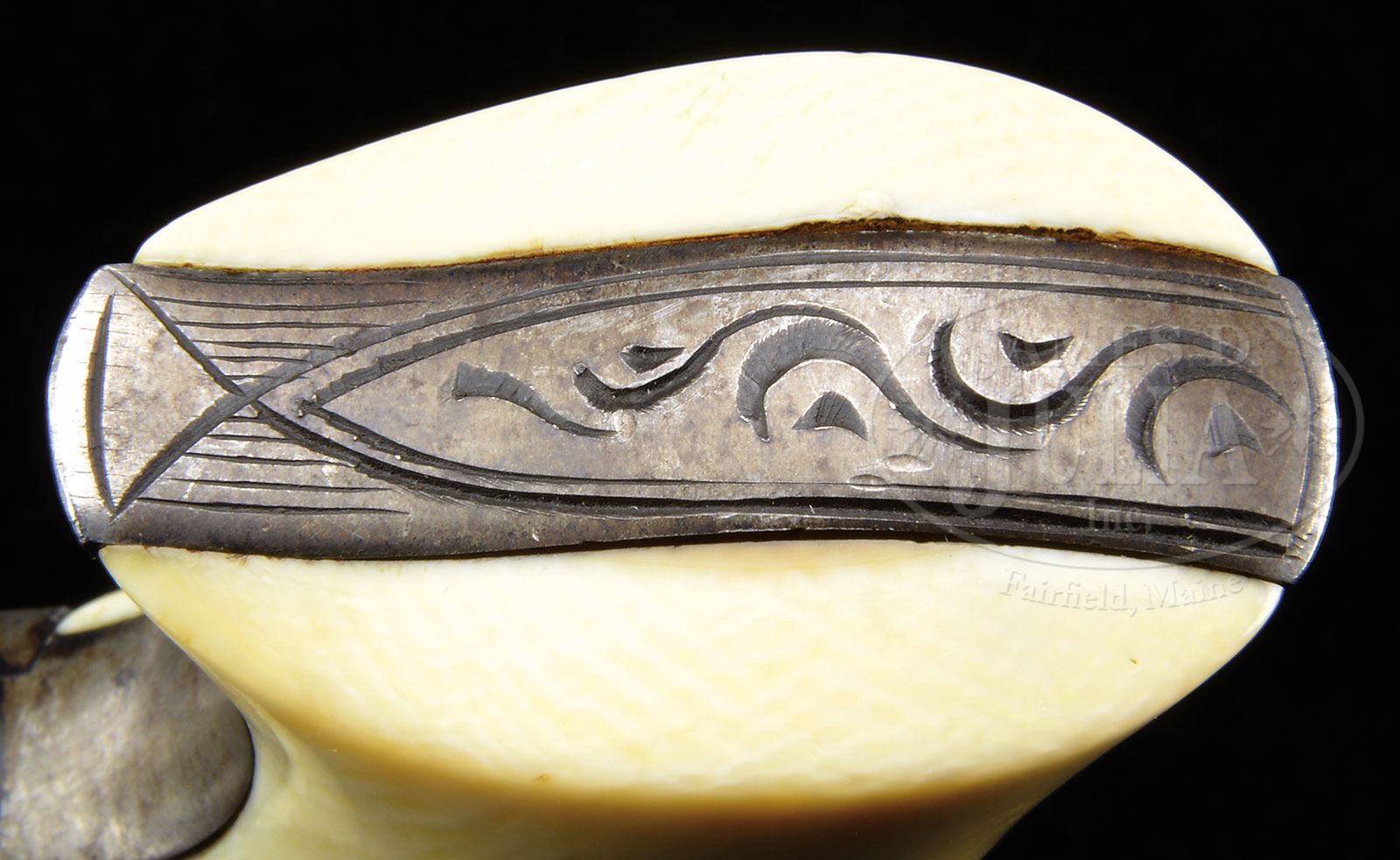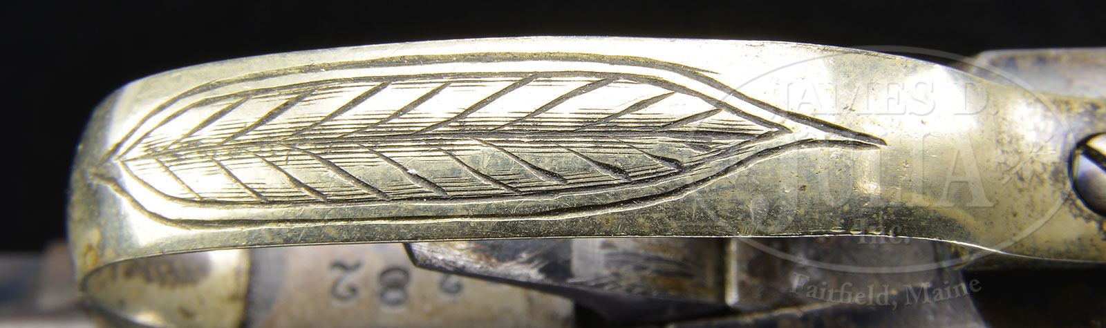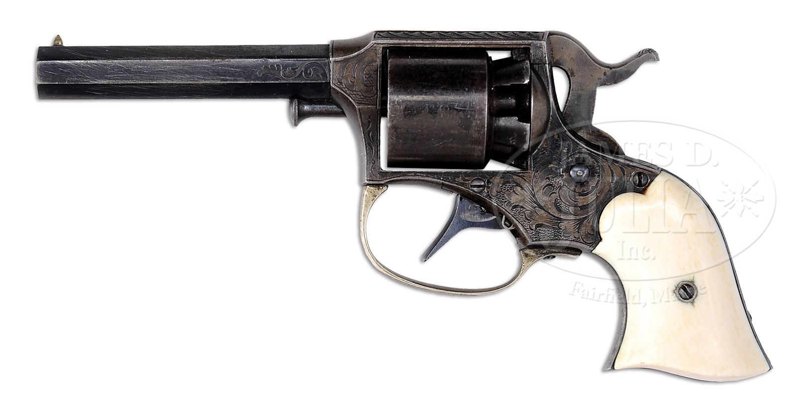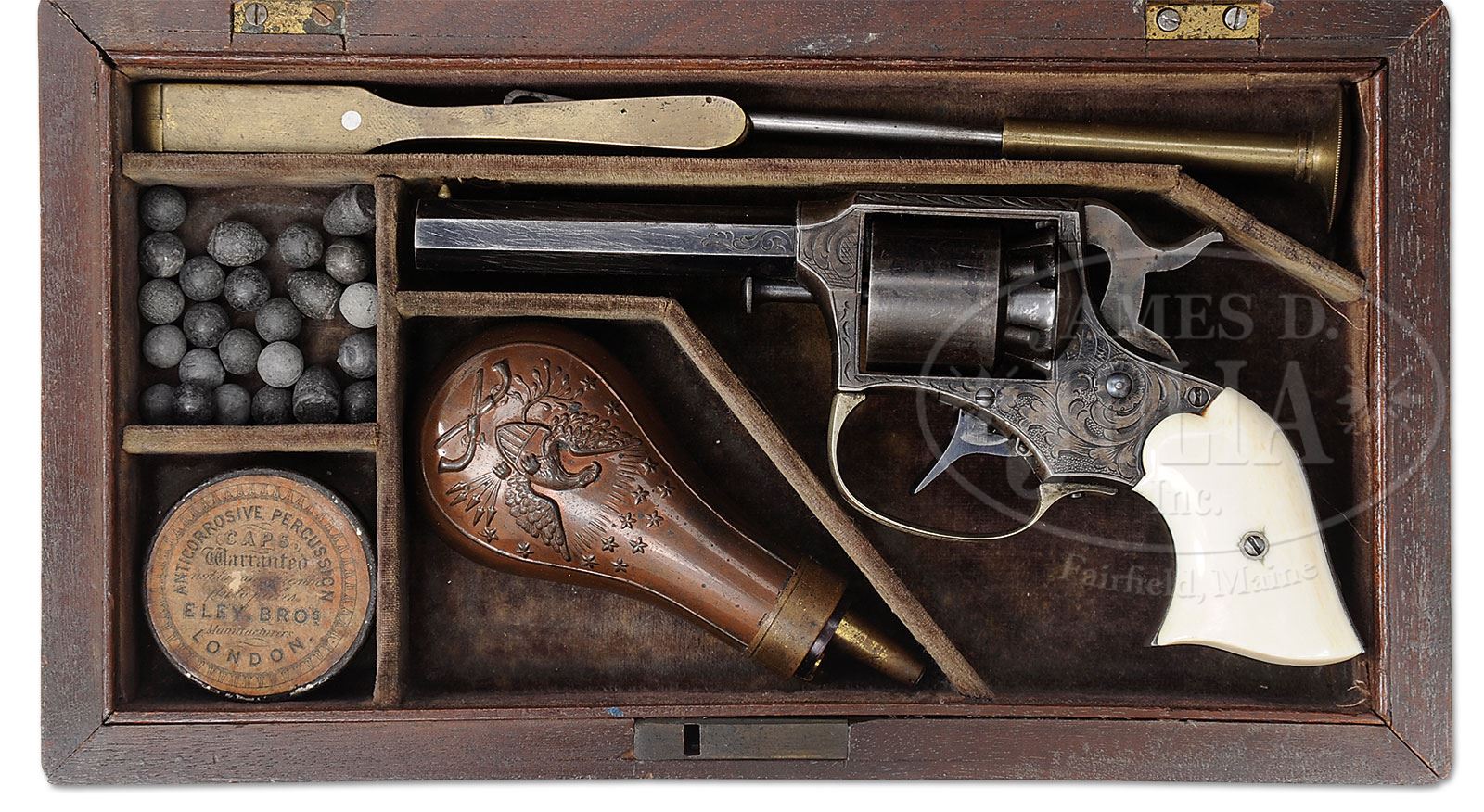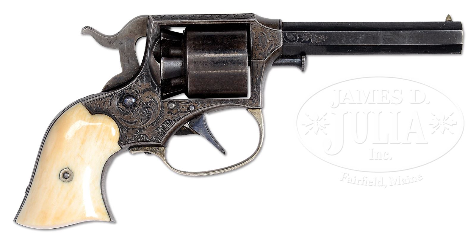RARE CASED ENGRAVED REMINGTON-RIDER DA POCKET PERCUSSION REVOLVER.SN 6382. Cal. 31. Silver & blue finish with 3-1/8″ oct bbl, German silver cone pin front sight and 2-line address. Bbl is blue and the frame is silver plated with a nickel silver trigger guard. Cylinder is mushroom shaped and has five chambers. Mounted with smooth 2-pc certifiable antique ivory grips. Frame is engraved in early scroll style of foliate patterns with fine pearled background and a large rosette on each side around the hammer pin. Side flats of bbl and top flat are engraved to match with matching patterns at the heel of the back strap and on butt strap. Top strap is engraved in feather patterns as is the trigger bow. Accompanied by an orig purple velvet lined mahogany casing, compartmented in the bottom for the revolver, a fine dbl sided eagle & stars flask, a brass 2-cavity ball mold without sprue cutter, a brass & steel mushroom head cleaning rod and a small tin of Eley Bros. caps. Although no definite number of revolvers manufactured could be established this model was produced 1860 to about 1873. One source states 2,000 produced and another source states 20,000. Regardless, this revolver was extremely popular as a concealed weapon and usually saw very hard service and are rarely found today with high orig finish. Extremely few had special plating and of those only a few were engraved and cased. Surviving complete examples today are rare. Special Note: This item contains or is made of ivory. Do not bid on this lot unless you have read and agreed to our “Ivory Position Statement” and the “Waiver of Legal and Financial Risk to James D. Julia in regards to your Purchase of an Ivory Object”. This information is located in our catalog on pages 30 and 31. PROVENANCE: The Elliott Burka Estate Collection. CONDITION: Very fine. Bbl retains 75-80% glossy orig blue with some fine scratches on left side; frame retains most of its orig silver plating with the grip frame gray metal patina; cyl retains 60-70% thin orig blue with strong blue in four of the five chambers; hammer retains bright case colors on rear edge, lightly to moderately faded elsewhere. Grips are sound with only one small age line and retain a fine ivory patina. Mechanics are crisp, bright shiny bore, may be unfired. Case is sound with light handling & storage nicks & scratches and retains most of its orig varnish; interior is heavily faded with moderate to heavy soil in the bottom especially from contact with lead balls; flask is extremely fine retaining about 98% orig finish on the body and about 60% gold wash on the collar & spout; thumb lever retains most of its orig gold and the spring bright blue; other accessories are fine. 4-56305 JR135 (4,000-6,000) – Lot 1101