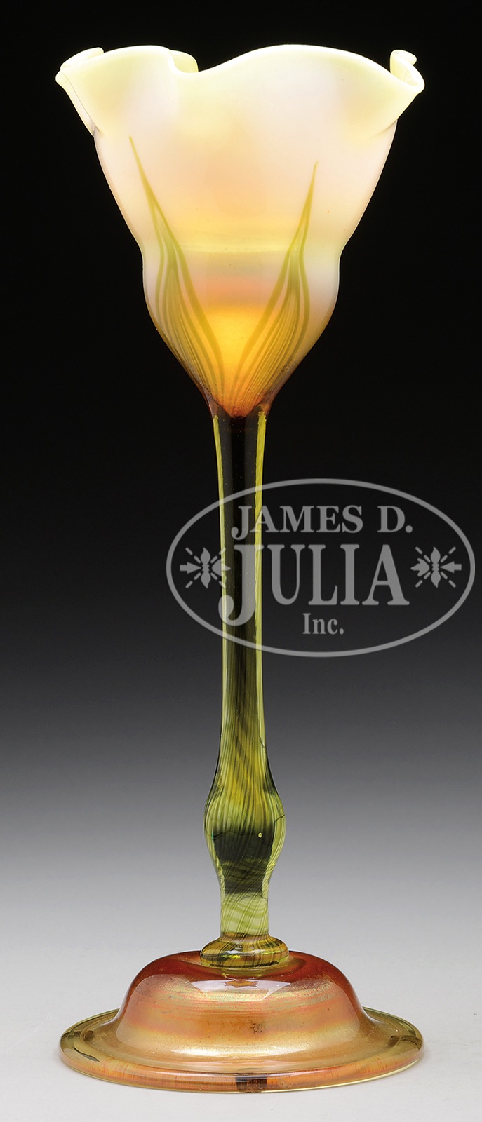 TIFFANY FAVRILE FLOWER FORM VASE.Tiffany flower form vase has gold iridescent translucent inverted saucer foot with applied green pulled feather stem leading to the pulled feather design on the outside of the cup against a lightly iridescent white ground. Interior of the flower form cup is finished in gold iridescence and shades to yellow at the ruffled and lightly stretched lip. Signed on the underside “L.C.T.” SIZE: 13″ t. CONDITION: Very good to excellent. 48978-8 (7,000-9,000) – Lot 1102