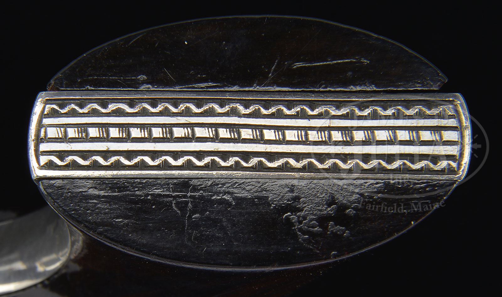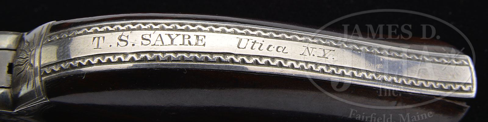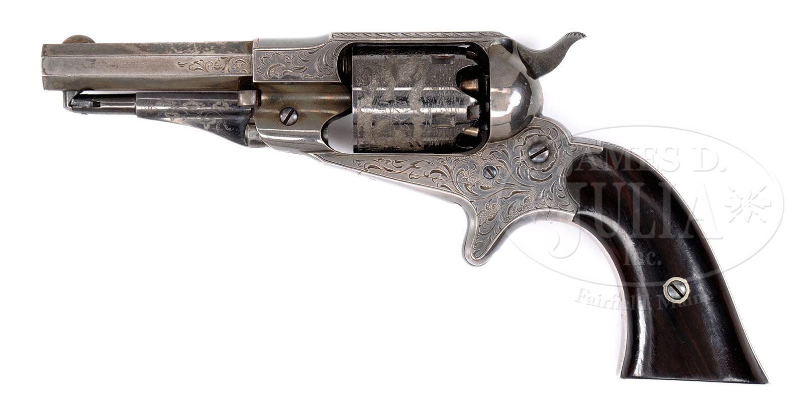 RARE INSCRIBED & ENGRAVED REMINGTON NEW MODEL POCKET PERCUSSION REVOLVER.SN 1679. Cal. 31. Third type with silver finish, 3-1/8″ oct bbl, German silver half moon front sight and 3-line address. Frame & trigger sheath are iron and cyl is unfluted with five chambers. Mounted with smooth 2-pc rosewood grips matching numbered to this revolver. Accompanied by an orig factory conversion cyl in caliber 32 RF with assembly number “1286”. Revolver is beautifully engraved with about 65-70% coverage flowing foliate arabesque patterns that has fine pearled background. Matching engraving patterns are on front side flats of frame and side flats of bbl. Top of back strap has a half sunrise and the back strap is engraved “P.S. SAYRE Utica N.Y.”. Edges of the back strap & butt strap have fine chip pattern borders. Web of the rammer handle is etch engraved in grape leaf & vine patterns. Percussion cyl is etch engraved in the Union/Confederate charging cavalrymen shooting at each other. The conversion cyl has a full band of foliate arabesque patterns. According to Flayderman’s Guide to Antique American Firearms there were about 25,000 of these revolvers produced 1865-1873. Very few had special plating and of those extremely few were engraved with inscribed specimens and both cylinders exceedingly rare. PROVENANCE: The Elliott Burka Estate Collection. CONDITION: Extremely fine. Overall retains about 98% strong orig silver plating and about all of the orig blue on rammer handle; percussion cyl retains about 98% crisp orig blue and appears to be ufnired showing virtually all of its orig blue in the chambers; cartridge cyl, possibly from another revolver, shows about 60% thin orig blue. Grips are sound with only one or two very minor scratches and retain virtually all of their orig varnish. Mechanics are crisp, brilliant shiny bore with one spot of pitting. 4-56320 JR137 (7,500-9,500) – Lot 1103