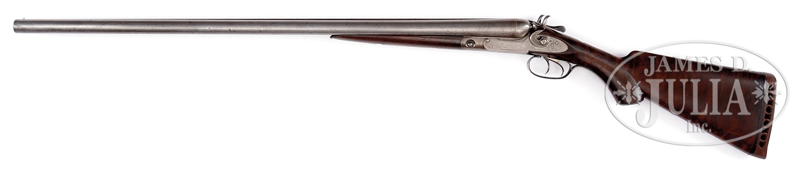 PARKER GRADE 1 TOP LEVER HAMMER SXS SHOTGUN TWO BARREL SET.SN 52292. Cal. 10 ga. Bbls: 30″ laminated steel bbls with FULL & FULL chokes and 2nd set of 26″ bbls accompany this gun. 2-7/8″ chambers #2 frame. Top lever action having straight line border engraving with scroll accents. Dbl triggers and extractors. Steel tipped splinter forearm of checkered walnut. Checkered walnut stock has hard rubber grip cap and name shield at wrist. LOP: 14 1/8″ after market Ranger ventilated pad. Factory letter confirms this gun was ordered and delivered as an orig two bbl set. CONDITION: Metal finish has faded to even gray with small spots of light pitting. Bores show light pitting. Refinished stocks have partially visible checkering with scattered handling marks. Stock has repaired crack along extending from trigger guard into wrist with hairline crack behind right lock. 50606-12 DS (1,250-2,250) – Lot 1104 Click here to view provenance