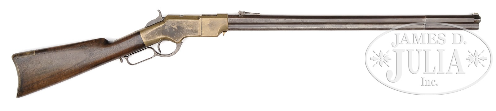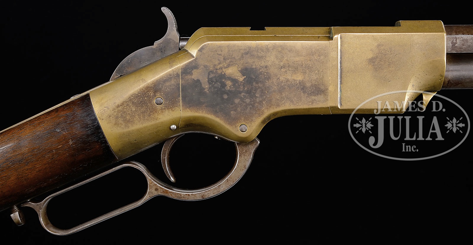EXTRAORDINARY REPRODUCTION MODEL 1860 HENRY LEVER ACTION RIFLE.SN 2112. Cal. 44 RF Henry. Usual configuration with 24-1/4″ oct bbl that has integral magazine, slightly modified early style German silver front sight blade and 900 yd Henry-style ladder rear sight. Mounted with uncheckered American walnut buttstock that has straight grip and 1st type brass buttplate with rnd heel & large trap; serial number is found on the top barrel flat between the rear sight & receiver, left side of lower tang under the wood, top tang channel of buttstock and inside toe of buttplate. Rnd portion of bbl, under loading sleeve is marked with the assembly number “2032” with matching number on rear face of loading sleeve. All three tang screws and both buttplate screws are matching numbered to the rifle. Buttplate screws are bevel head type. Rifle has several early features including small bbl address, sharp radius on top rear of receiver, slight perch belly stock and rnd heel buttplate. This rifle appears to be the product of the late Ron Kudrick of Reno, Nevada, who was known to have expertly produced many Henry rifles in the recent past that have consistently fooled the unwary. This rifle is so expertly made that it would deceive most collectors. PROVENANCE: Collection of Dr. Douglas Sirkin. CONDITION: Very good to fine, all matching incl screws. Bbl & magazine tube retain a mottled brown patina and may have been orig brown finish; receiver & side plates retain sharp edges with tight metal to metal fit, and appears to have been polished a very long time ago and now retains a dark brass patina; buttplate is a matching patina. Buttstock is sound and retains an old refinish. Mechanics are fine. Bright shiny bore. 4-49738 JR36 (6,000-10,000) – Lot 1106