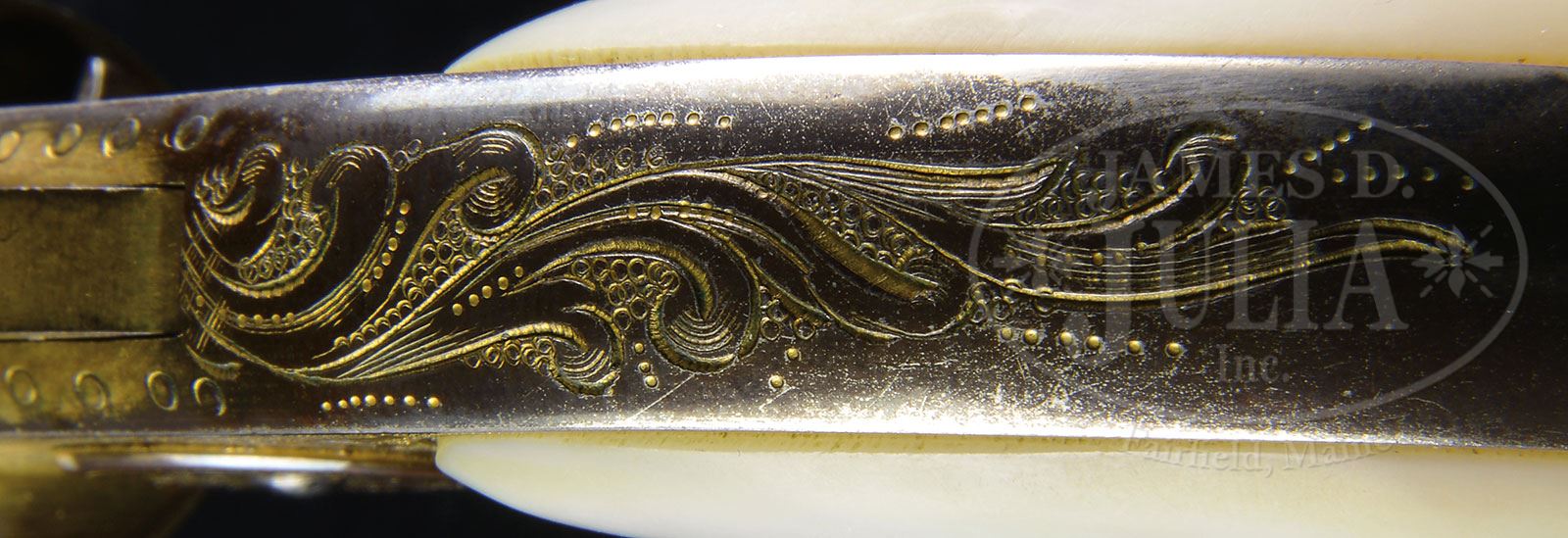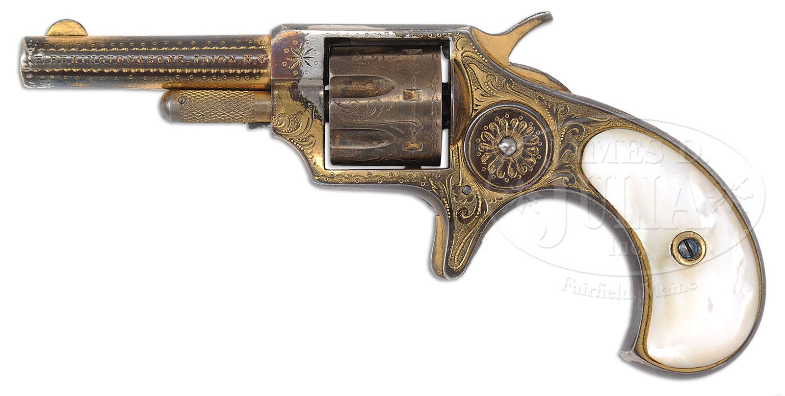 VERY RARE ENGRAVED WITH GOLD FINISH REMINGTON IROQUOIS SPUR TRIGGER REVOLVER.Cal. 22 Short. Very rare revolver with 2-1/4″ rnd bbl that has half moon front sight, marked on the top “IROQUOIS” and with the Remington name & address on the left side. Cylinder is fluted with seven chambers and it is mounted with 2-pc smooth pearl grips. Revolver is gold finish over silver and engraved by L.D. Nimschke with about 70% coverage foliate arabesque patterns that have very fine stippled background. Top strap & sides of frame below cylinder are engraved in snake & dot patterns. Top front side flats of frame are engraved with hunter stars. Back strap is engraved in matching foliate arabesque patterns. Cylinder also has matching patterns with a leaf & vine border around rear edge. There were about 10,000 of these tiny revolvers produced in the period 1878-1888 with fluted & unfluted cylinders with the fluted version being substantially more scarce. Engraved examples are extremely rare. PROVENANCE: The Elliott Burka Estate Collection. CONDITION: Very fine. Overall retains about 50% orig gold finish with the loss areas exposing the dark silver plating which was under the orig gold wash; cyl retains traces of gold, being mostly a dark silver patina. Grips are sound showing great fire and bright colors. Mechanics are crisp, strong bright bore with a few scattered spots of fine pitting. 4-56371 JR168 (3,000-5,000) – Lot 1106