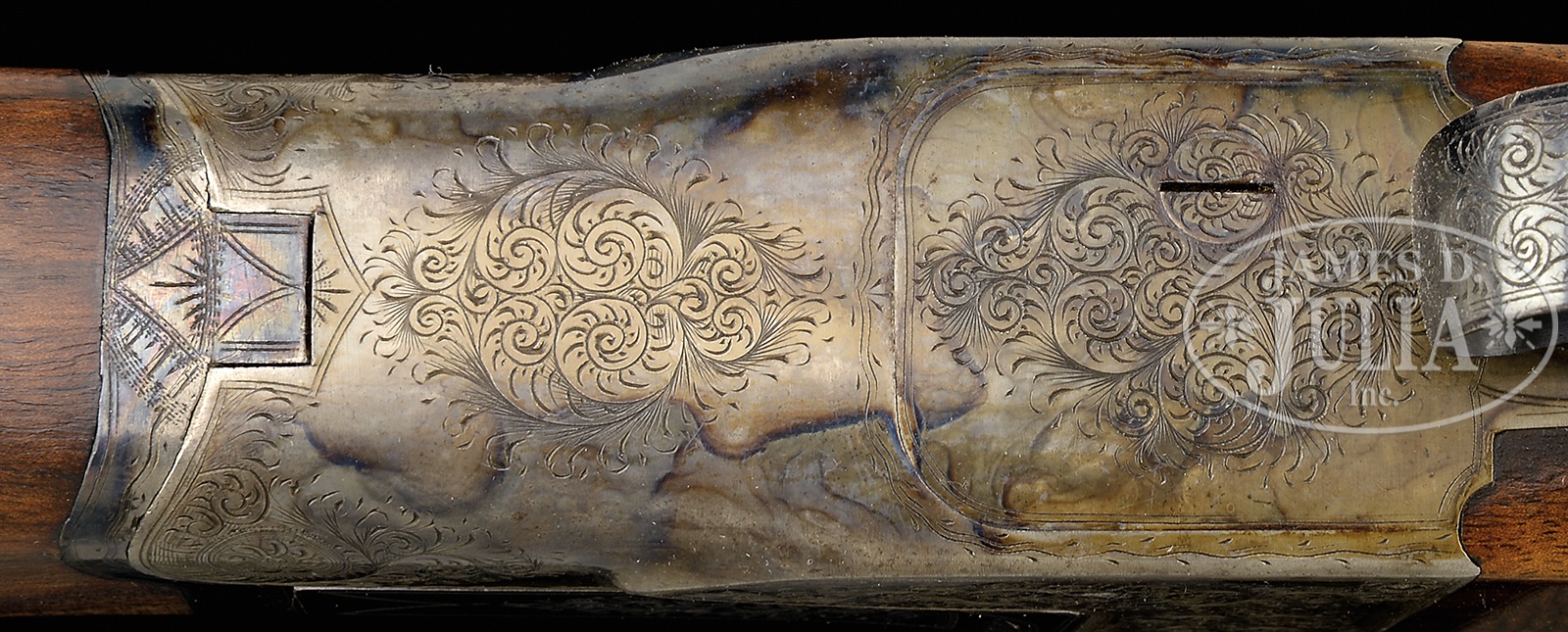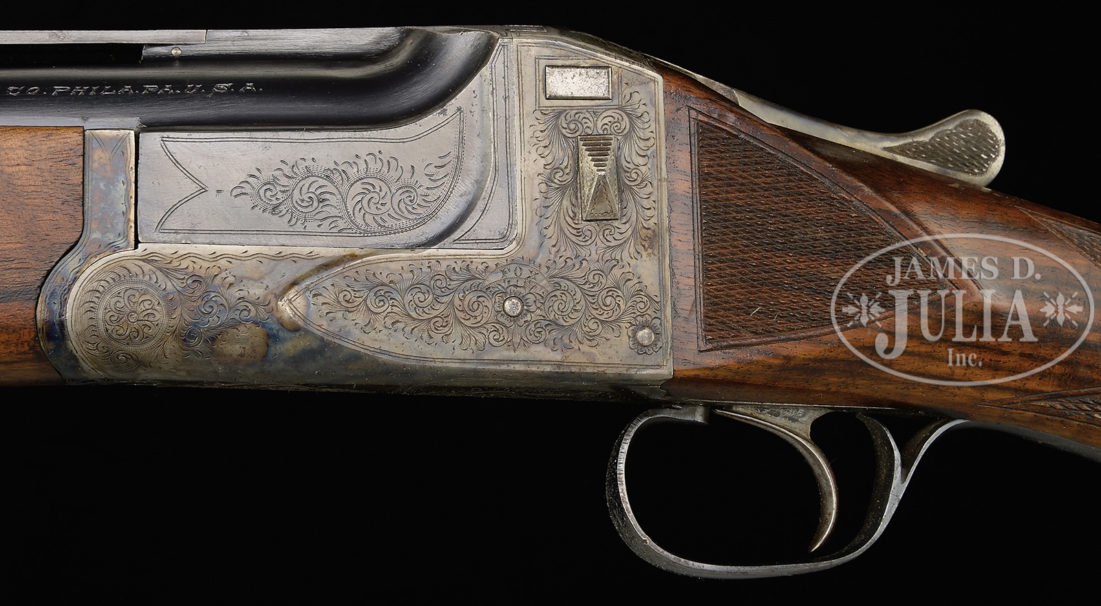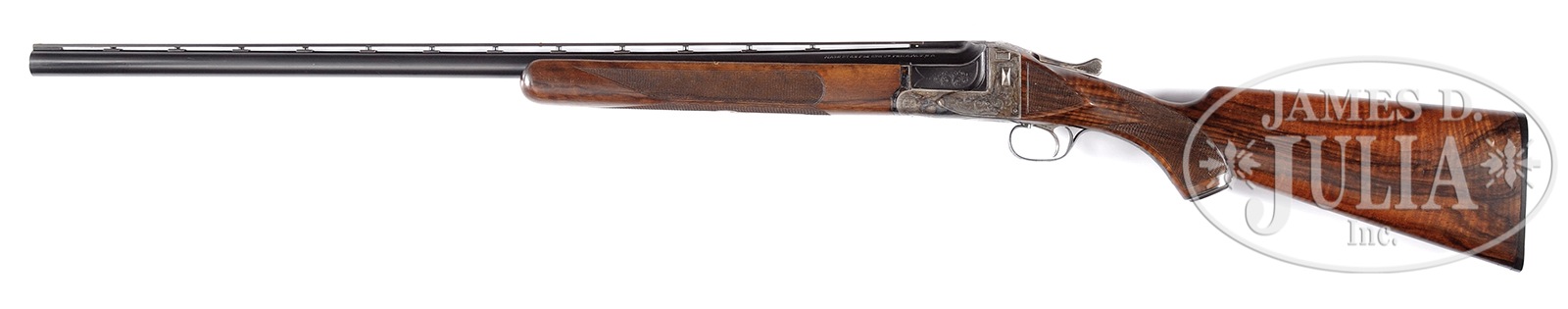 SN 400106. Cal. 12ga. Chambers 2-3/4″, 30″ Chromox steel bbl, choke Full. J grade engraved ejector action, with generous, handsome scroll work. Standard trap fore-end. Sgl trigger, nicely figured buttstock with A. H. Fox marked capped pistol grip. 14-3/4″ to hard rubber buttplate. DAC 1-1/2″, DAH 2-1/4″. Accompanied by Fox historian Callahan letter dated Nov 2006, verifying configuration of gun. Shipped June 18, 1920 to E. K. Tryon Co of Philadelphia. No safety. CONDITION: Fine. Gun retains a high percentage of factory finishes. Bbl retains nearly all of orig blue with minor handling marks and rib appears sound. Bright shiny bore with no pitting. Receiver and top lever retain much of their original case colors, displaying period, blue, grey and putty hues. Trigger guard retains nearly all of its “fiery” factory blue. Wood is fine, sound and unaltered with sharp checkering, minor handling marks; oil finish. The buttstock is highly figured with fiddleback throughout. Correct ribbed buttplate. Fore-end iron has bright, bold case colors evident. Fore-end release retains full case color. Top lever right of center. Gun operates crisply, strong ejector. Fine screws. An unusually nice example of a fine and unmolested sgl bbl Fox trap gun. Existing Fox records indicate only 52 J-grades were produced with 30″ barrels. 50362-1 FTL (3,000-5,000) C&R – Lot 1106