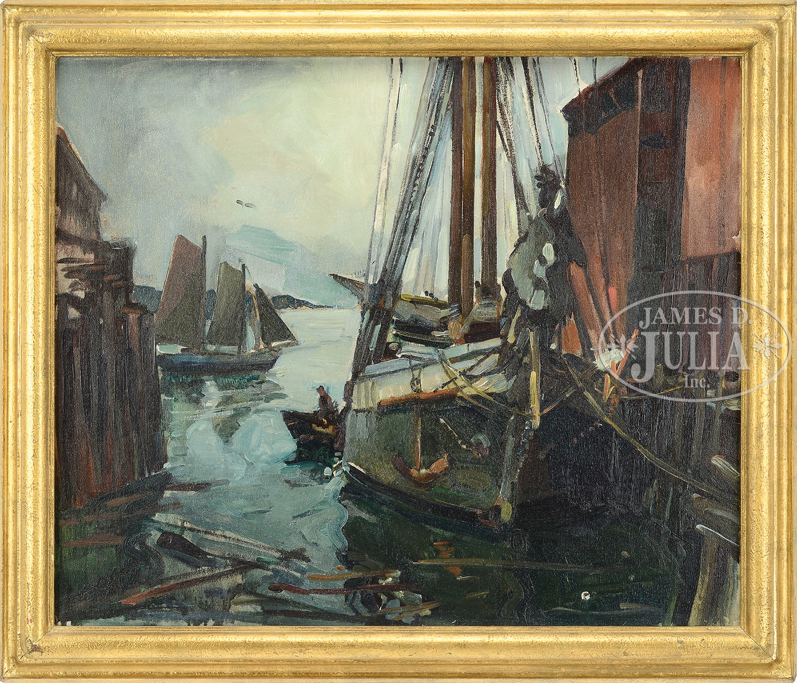 WILLIAM LESTER STEVENS (American, 1888-1969) FISHING BOATS AT HARBOR.Oil on canvas Housed in a good gilt molded wood frame Signed lower left “W. Lester Stevens” (hard to see as it is black on green) SIZE: 25″ x 30″. Overall: 29-1/2″ x 34-1/2″ CONDITION: Lined, inpainting, very good 50844-4 (5,000-7,000) – Lot 1108
