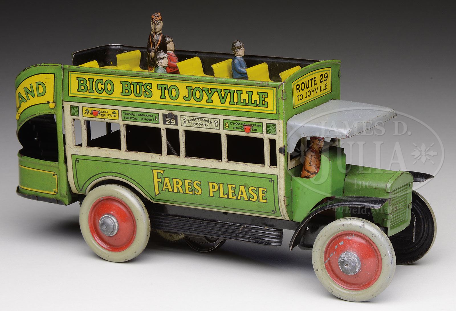 BIKO “BUS TO JOYVILLE”.A great little lithographed German double-decker bus with an animated attendant on the upper level collecting bus fare. Finely lithographed with various advertisements on side of the bus, and when wound the bus moves forward & the attendant on upper level goes from front to back collecting fares from prospective passengers. Three passengers present, and perhaps more were intended as there are three empty slotted seats on the upper level(?). Overall condition is very good to fine and it is believed that this bus was intended for the English market as it has that feel & look about it. SIZE: Approx 8″ l. PROVENANCE: The Estate of Carol and Jerry Soling. CONDITION: As stated above. 1-14694 (700-900) – Lot 1109 Auction: Advertising, Toy & Doll Auction - Fall 2014 Please Note: All prices include the hammer price plus the buyer’s premium, which is paid by the buyer as part of the purchase price. The prices noted here after the auction are considered unofficial and do not become official until after the 46th day. |