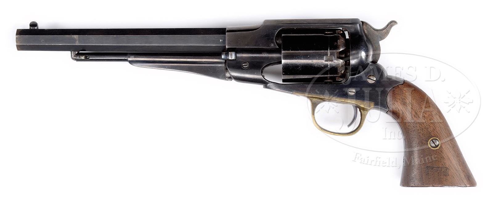 EXCEPTIONAL MARTIALLY MARKED CIVIL WAR REMINGTON NEW MODEL ARMY PERCUSSION REVOLVER.SN 122959. Cal. .44. Blue finish with 8″ oct bbl, pinched post front sight & 3-line address. “PATENTED SEPT. 14 1858 / REMINGTON & SONS. ILION NEW YORK U.S.A. / NEW MODEL”. Trigger guard is brass and it is mounted with 2-pc walnut grips and has a crisp, clear cartouche on left side. PROVENANCE: The Estate Collection of Phil A. Bleakney, Jr. CONDITION: Very fine+, all matching including grips, bbl, loading arm and frame retains about 95% glossy orig blue. Small nicks and scratches, some losses at muzzle. Cylinder retains 70% orig blue with one large patch flaked to a grey/blue patina. Hammer retains bright case colors. Grips are sound, solid, well fit with several large gouges on butts. Mechanics are crisp well defined bore. 49059-151 JS (3,500-5,500) – Lot 1109