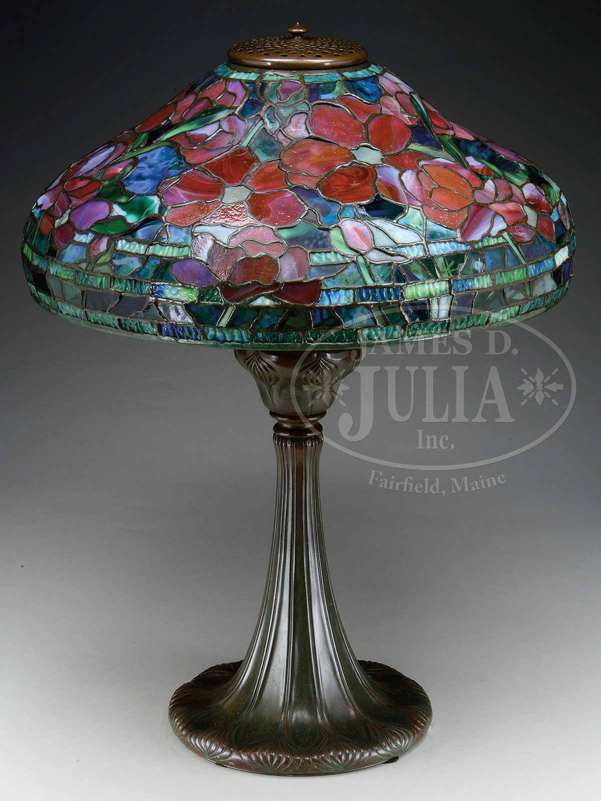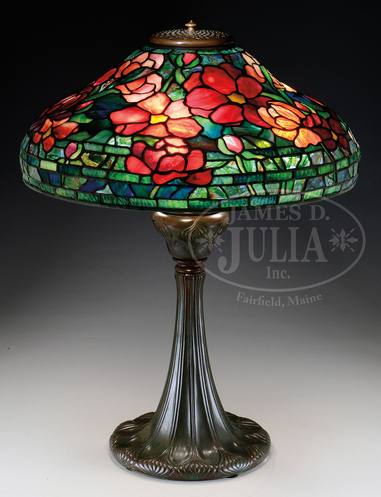 TIFFANY STUDIOS PEONY TABLE LAMP.Tiffany Studios table lamp has leaded glass shade with bright red and pink peonies and striated green leaves and stems all against a confetti glass background. Shade is signed on the inside rim “Tiffany Studios New York”. Shade rests on a Tiffany Studios bronze base has onion design surrounding the round foot, with stems climbing the side of the base. Base is complete with 3-socket cluster and acid etched heat cap all finished in a rich brown patina with subtle green highlights. Signed on the underside “Tiffany Studios New York 368”. SIZE: Shade 18″ dia. Lamp 25″ t. PROVENANCE: From an Unreserved Texas Estate. CONDITION: Shade is very good with some tight hairlines. Base is very good to excellent with only minor wear and discoloration to patina. Rewired with appropriate cloth cord. Heat cap has different patina than base. 51362-47 (35,000-55,000) – Lot 1109