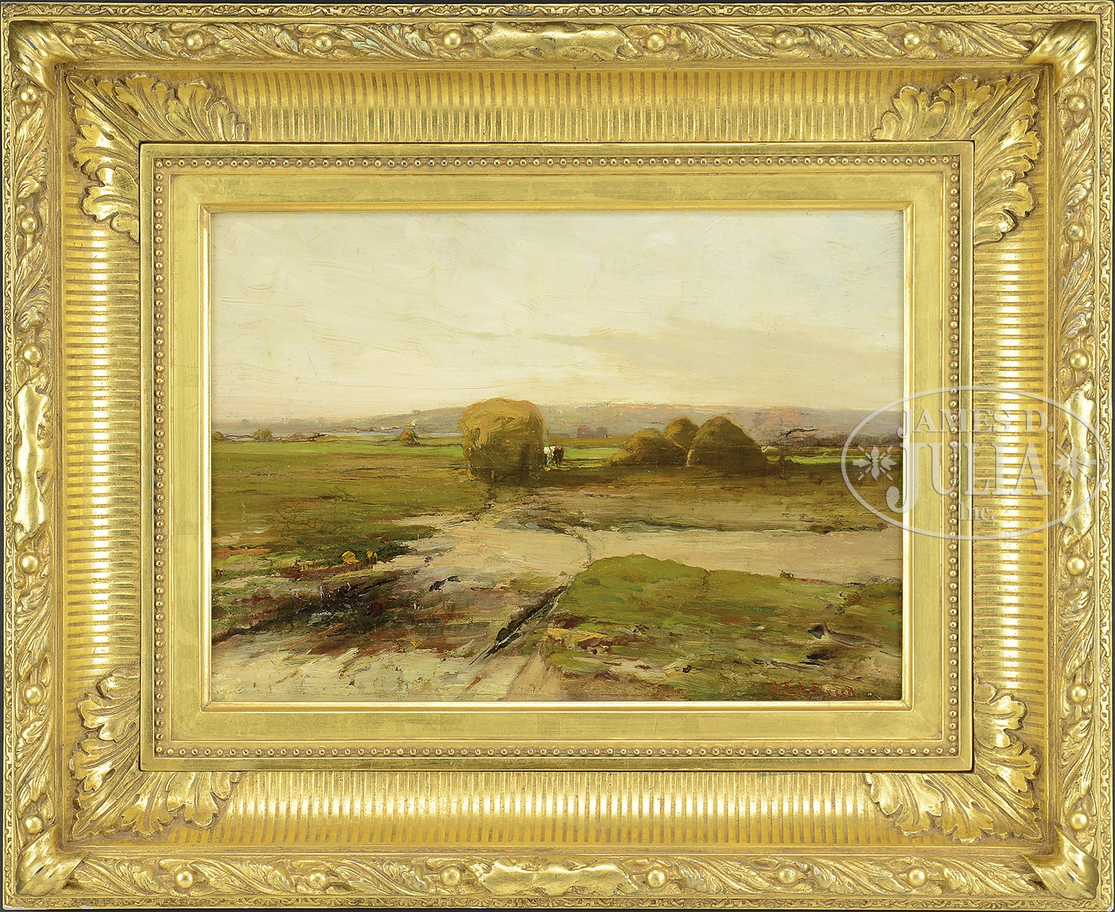 CHARLES EDWIN LEWIS GREEN (American, 1844 – 1915) SAUGUS MARSH HAYSTACKS.Oil on canvas Housed in a fine gesso decorated gilt frame Signed lower right “CEL Green” SIZE: Sight: 9-1/2″ x 13″ Overall: 17″ x 21″ CONDITION: Very good 9-94128 (4,000-6,000) – Lot 1110