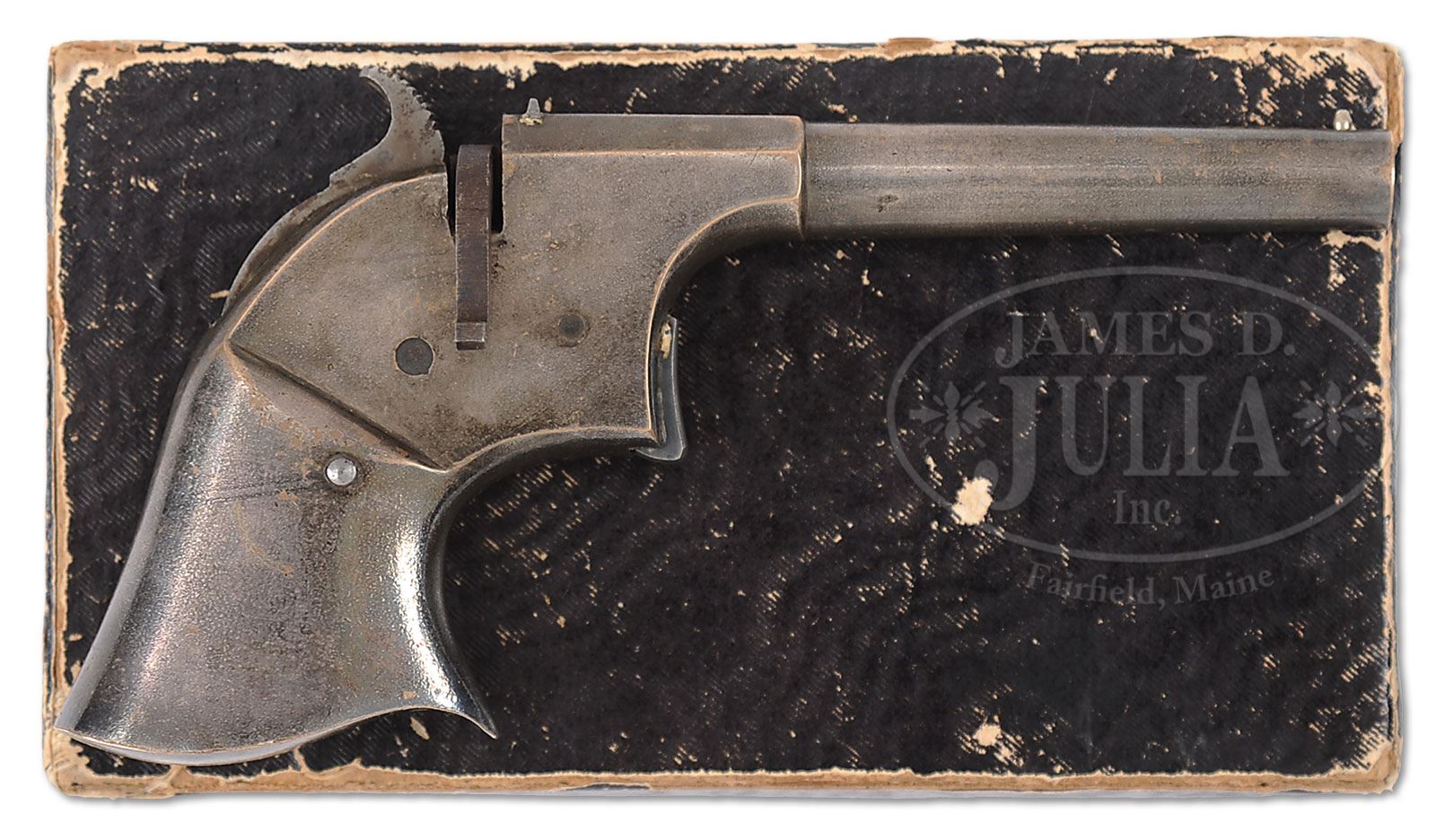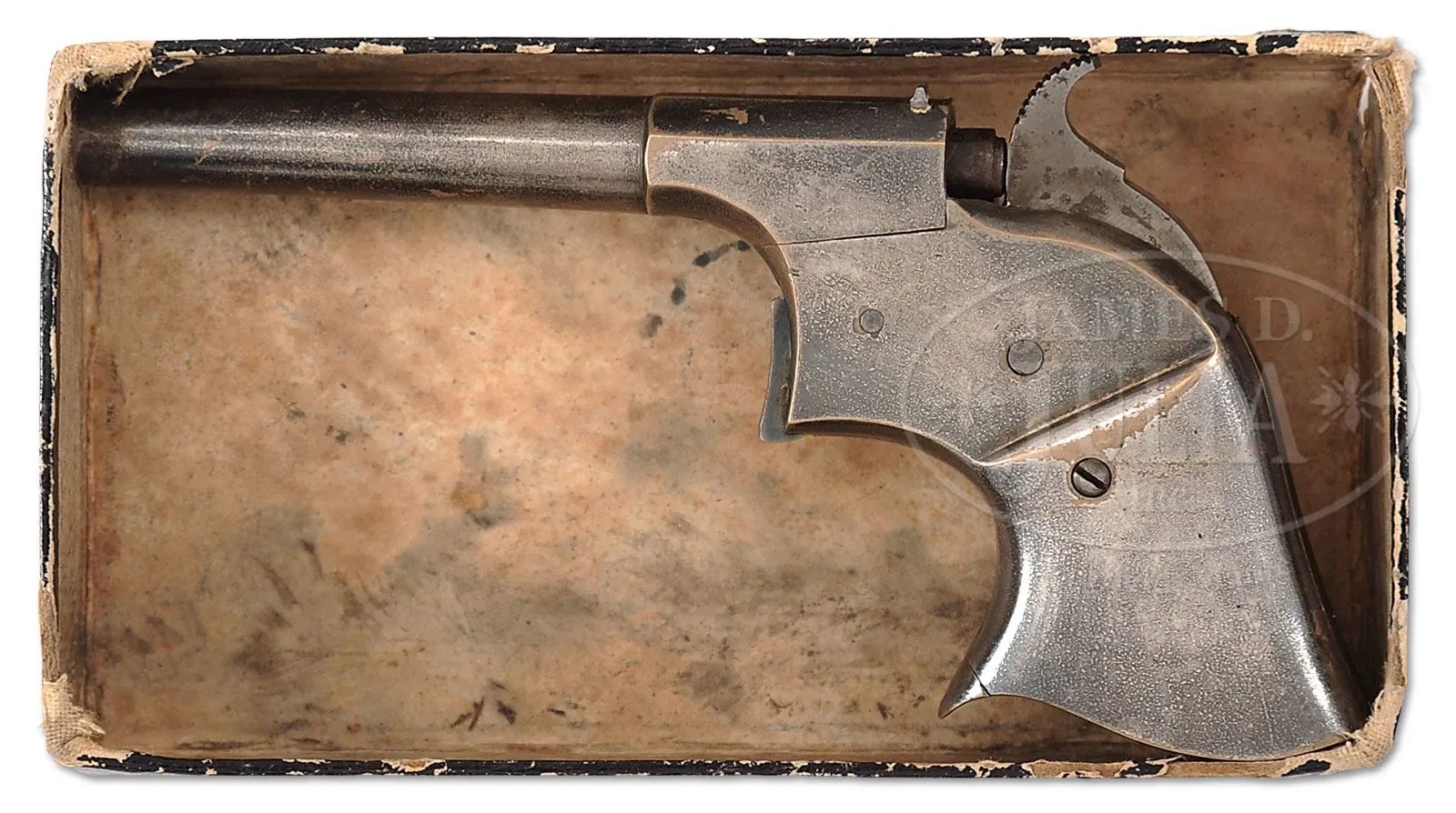 Cal 17. Silver finish over the all brass pistol with integral bbl & frame. Bbl has pin front sight and fixed rear sight in top flat. This was the smallest pistol produced by Remington with only about 200 made 1860-1863. Normally these little pistols have rider patent markings on left side flat of bbl. This one is without those markings. This little pistol has it’s orig 2-pc breech block. Accompanied by an orig black cardboard 2-pc box with blue paper covered bottom. Also accompanied by a small handwritten letter dated Jul. 16,1868, addressed to “Friend Byron” which appears to be transferring a parlor pistol with instructions on how to use it and signed “A.J. Carlton”. These little pistols, as noted above are extremely rare, especially one with orig breech block. They are even more rare with strong orig finish and an orig box is practically unknown. PROVENANCE: The Elliott Burka Estate Collection. CONDITION: Pistol is very fine to extremely fine. Overall retains 95-97% strong orig silver with some fine freckling and light flaking. Trigger & hammer retains faded case colors. Breech block is a dark brown crusty patina. Box has one broken corner in the bottom otherwise is sound showing moderate to heavy edge wear with heavy foxing and soil inside. Altogether a very rare set. 4-56492 JR181 (5,500-7,500) – Lot 1110