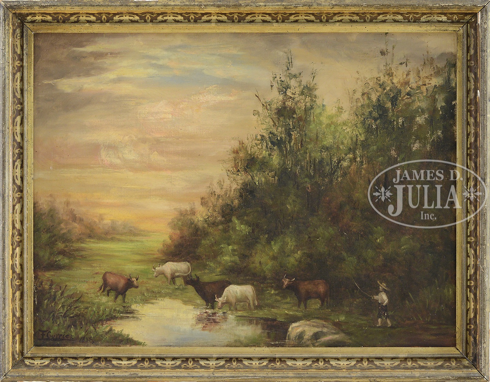 Please Note: Upon further examination, we cannot guarantee that this painting was by Frank Currier (1843-1909). FRANK CURRIER (American, 1843-1909) LANDSCAPE WITH COWS AT A WATERING HOLE.Oil on canvas Housed in a gilt decorated 19th century frame Signed and dated lower left “F Currier 1888″ SIZE: 18″ x 24”. Overall 21″ x 27″ CONDITION: Good, surface grime, discolored varnish, minor craquelure in sky 51515-1 (1,000-2,000) – Lot 1110