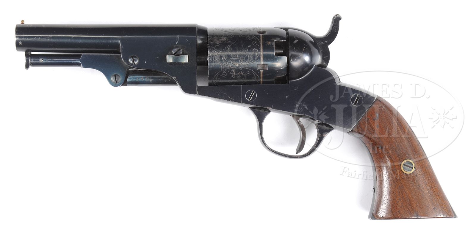 RARE HOPKINS & ALLEN DICTATOR PERCUSSION REVOLVER.SN 1353. This is a well presenting example of a scarce percussion pistol made circa 1870 by Hopkins & Allen, Norwich, Connecticut. Gun conforms to other percussion models with 4″ rnd bbl marked on top “DICTATOR”. PROVENANCE: The Estate Collection of Phil A. Bleakney, Jr. CONDITION: Excellent as refinished retaining over 95% blue, panel scenes are weak due to polish prior to re-bluing. Gun appears orig and matching, stocks well fit with chip to left toe and restored right toe. Mechanically gun functions with crisp well defined bright bore. 49059-133 JS (1,000-2,000) – Lot 1112
