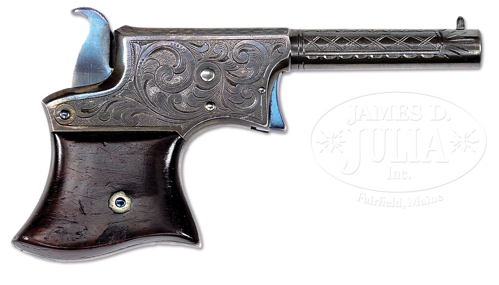 EXTRAORDINARY ENGRAVED REMINGTON SAW HANDLE VEST POCKET SINGLE SHOT DERRINGER.SN 15129. Cal. 22 Short. Silver finish with 3-1/4″ rnd bbl integral with the frame & pin front sight. It has saw handle shape grip mounted with smooth 2-pc rosewood grips. Top flat of frame has 2-line address. Pistol is engraved in wonderful foliate arabesque patterns that has very fine pearled background with full coverage on the sides. Top side flats of the frame are engraved in a twisted rope pattern. Sides of the bbl are engraved in diamond patterns with a chip & dot border. Back strap & butt strap are engraved in geometric patterns. Trigger, hammer & screws are fire-blued. Although this little pistol was produced in fairly large numbers, estimated at 17,000-20,000 pieces, very few were engraved and of those extremely few had special finishes. Finding one today with high orig finish is a great rarity. PROVENANCE: The Elliott Burka Estate Collection. CONDITION: Extremely fine plus. Overall retains virtually all of its fine silver finish with coating of lacquer; trigger, hammer & screws retain about all of their bright fire blue. Grips are sound and retain most of their orig varnish. Mechanics are crisp, strong bore with good rifling & light pitting. 4-56326 JR144 (3,000-5,000) – Lot 1113