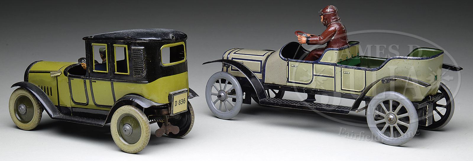 PAIR OF WINDUP GERMAN LIMOUSINES.The first vehicle, larger of the two, most likely is a Carette and features a somewhat oversized driver with an open rear passenger area. Litho’d in a light grey with dark blue highlighting, this vehicle is in very fine plus original condition. A little minor chipping where right rear fender rubs against body of car, and slight chipping to right side of chauffeur. Second vehicle, possibly Bubb, is an open chauffeur section with an enclosed passenger compartment. Enameled in a pea green with black highlighting and black passenger roof as well. Simulated disk tires with treads, car also features license plate at rear marked “D836”. Mechanics on both cars are functional, first car lacking twist key to wind up motor. SIZE: Approx 10-1/4″ & 8-1/4″ l respectively. PROVENANCE: The Estate of Carol and Jerry Soling. CONDITION: As stated above. 1-14747 (850-1,250) – Lot 1113 Auction: Advertising, Toy & Doll Auction - Fall 2014 Please Note: All prices include the hammer price plus the buyer’s premium, which is paid by the buyer as part of the purchase price. The prices noted here after the auction are considered unofficial and do not become official until after the 46th day. |