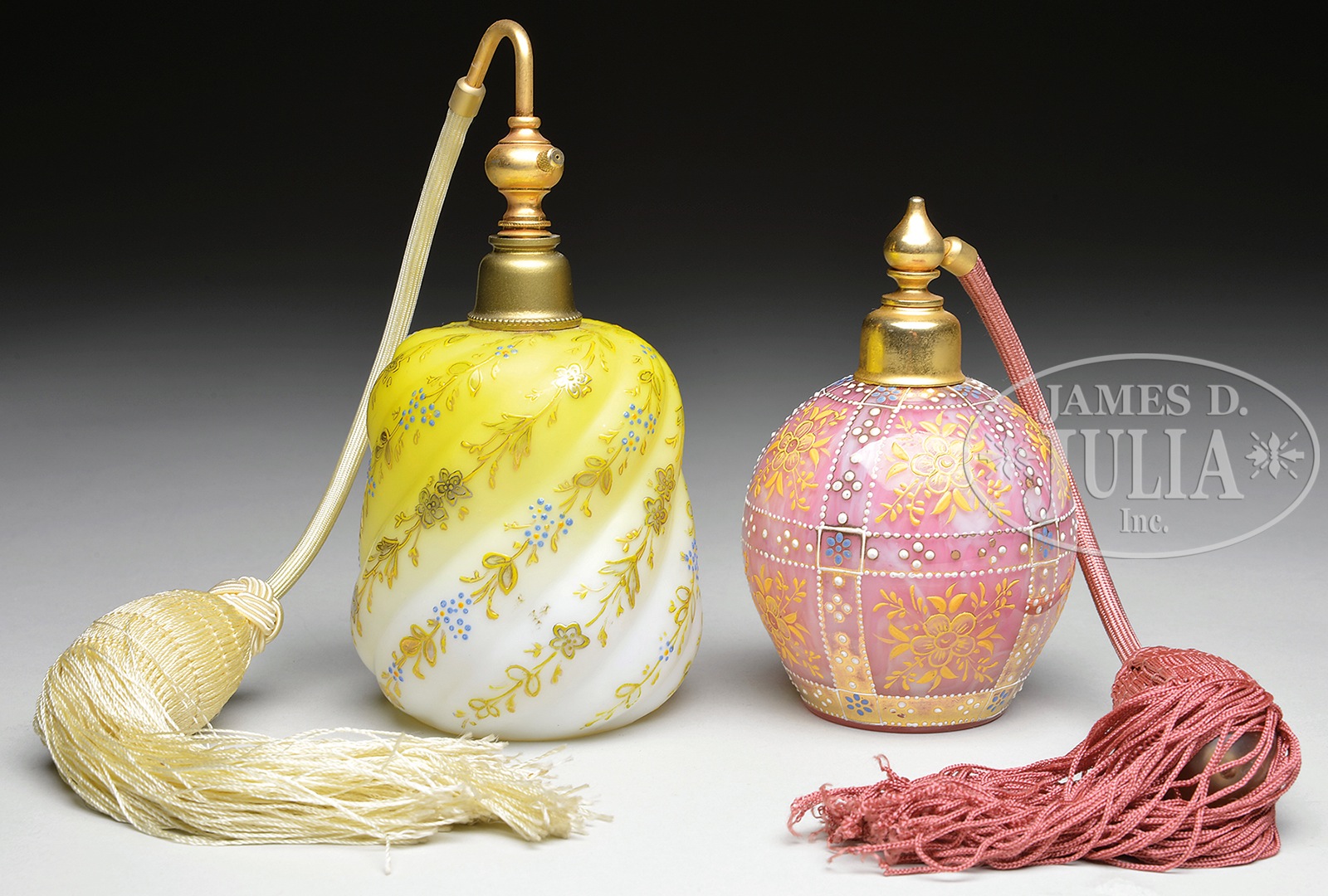 TWO MOSER ATOMIZERS.1) Moser atomizer has swirling diagonal ribbed body decorated with gold and silver flowers, stems and leaves, and delicate orange and blue flowers. Decoration is set against a white shading to yellow background. Atomizer is finished with its brass collar, nozzle with woven hose and bulb. 2) Moser atomizer has two rows of pale yellow enameled flowers, each framed by white beaded bands. Atomizer is complete with its brass collar and valve as well as woven hose and bulb. Atomizers are pictured in the book “Moser Glass, The Klabin Collection” by Gary D. Baldwin, p. 129, Plate 168. SIZE: 1) 7″ t. 2) 5″ t. PROVENANCE: George Klabin Collection CONDITION: Very good to excellent. 5-67429 (300-500) – Lot 1113a