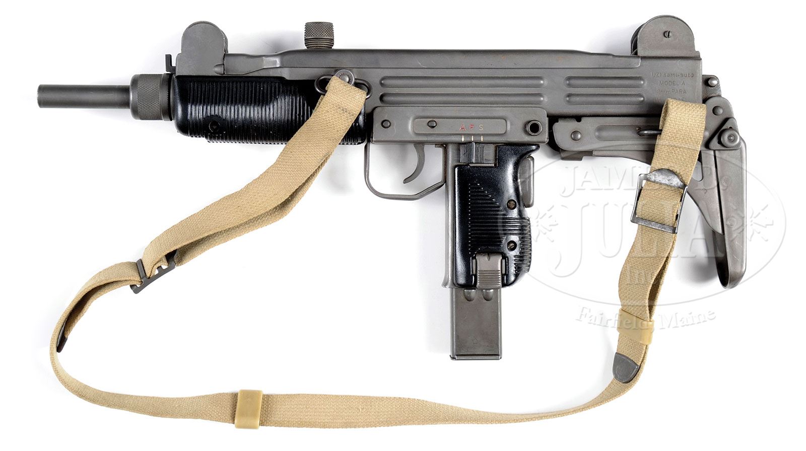 Please note: This is a registed receiver gun, and NOT a registered bolt gun. **ACTION ARMS CONVERSION OF ISRAELI MILITARY INDUSTRIES UZI MODEL A (FULLY TRANSFERABLE).SN SA10700. 9 MM. 10″ bbl. Receiver is marked on left side, “UZI semi-auto/MODEL A/9mmPARA/IMI-ISRAEL”. Included are 25-rnd and 32-rnd magazines and a web sling. This model has the bayonet stud at bottom of receiver at muzzle and fold out shoulder stock as well as grip safety on backstrap. Mechanism functions smoothly when operated by hand. This gun appears fully functional. CONDITION: Overall finish and appearance is excellent. Smooth gray finish with exception being flip up peep sight which is dark blue finish. Slight loss of finish on high lines. Bore is excellent, shiny and bright. Bolt face extremely fine. Interior receiver shows evidence of firing. This gun has a very comfortable weight and feels very solid. This model is accurate even out to long ranges. 4-51281 JWK97 (5,000-8,000) – Lot 1114