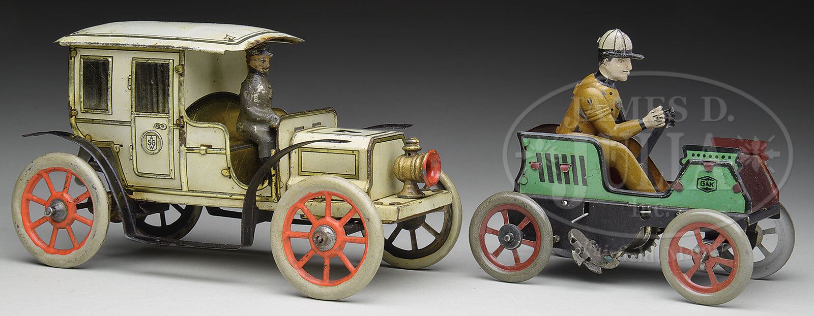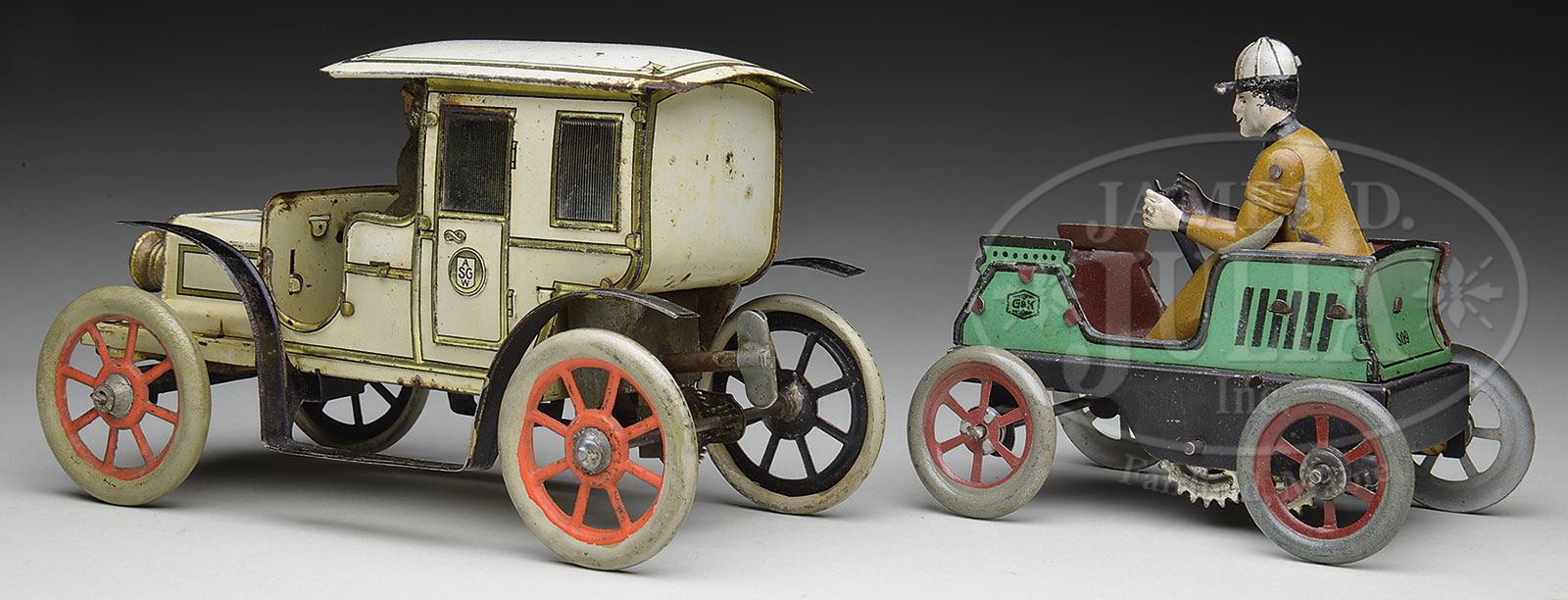 GUNTHERMAN #7 LIMOUSINE & GK VEHICLE.The first vehicle being a relatively obscure and very interesting limo lithographed in white with an abundance of gold highlighting. Cast lead single lamp on front end with a number 7 emblazed upon the engine hood. Trademark Guntherman mark on either passenger compartment doors and roof of the vehicle has an arrow pointing forward. Once begins to wonder, since the roof slides off, if the passenger compartment could also have been used to contain candies or sweets for a child, and perhaps this vehicle was sold in a candy or sweet shop. Circa 1910, the vehicle has simulated spoked tires and a rear wind clockwork mechanism which is in functional working order. The litho is still quite bright & the gold shows very little signs of oxidation as well. Second vehicle, the G&K, with the driver himself holding a rod between his legs and actually gives the image that it is an Irish mail-type vehicle. Lithographed in an apple green with the GK trademark on either side, a unique vehicle that is seldom found. Overall condition very fine plus to near mint. SIZE: Approx 6-1/2″ & 4″ l respectively. PROVENANCE: The Estate of Carol and Jerry Soling. CONDITION: As stated above, the Guntherman vehicle has small minor corrosion at right left rear corner. 1-14631 (800-1,200) – Lot 1114 Auction: Advertising, Toy & Doll Auction - Fall 2014 Please Note: All prices include the hammer price plus the buyer’s premium, which is paid by the buyer as part of the purchase price. The prices noted here after the auction are considered unofficial and do not become official until after the 46th day. |