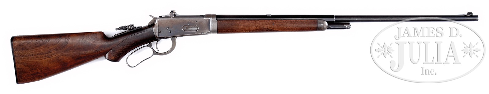 WINCHESTER MODEL 1894 SEMI-DELUXE TAKEDOWN RIFLE WITH HALF ROUND HALF OCTAGON BARREL.SN 141852. Cal. 30-30. 26″ half rnd half oct bbl with combination front sight, rear tang sight, and Lyman receiver sight. Checkered pistol grip stocks and Winchester pistol grip cap and hard rubber buttplate. CONDITION: Very good. Bbl retains 70-80% orig blue finish with high point wear, muzzle wear, and some scratching. Bore is frosty with strong rifling. Receiver retains 30-40% orig blue finish with carry wear on right side and high point wear overall. Lyman receiver sight is very good. Marbles tang sight is very good. Stocks are good and full sized. Checkering is worn smooth. Toe of buttstock has been trimmed along with bottom of hard rubber buttplate. Handling marks and scratches overall. An example of a Winchester Takedown rifle with a considerable number of special order features. 49971-67 TEP (2,500-3,500) – Lot 1114 Click here to view provenance