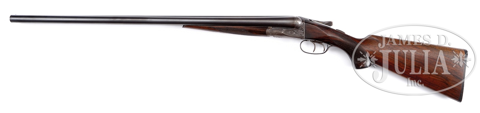 SN 31431. Cal. 12 ga. 28″ bbls, 2-3/4″ chambers, MOD & Full chokes. #3 Weight bbls. Single metal bead, concave matted rib. Splinter forend. AE ejector receiver with foliate engraving. Double triggers. Capped pistol grip. Nicely grained walnut. Hard rubber buttplate. LOP 14-1/4″, DAC 1-5/8″, DAH 3″. Automatic safety. CONDITION: Excellent. Bbls retain nearly all orig blue with slight thinning at breech. Bores are bright and unpitted. Receiver with deep orig case color in protected areas. Underside receiver patina from wear. Fine screws. Trigger bow blue with handling wear. Stock and forend excellent with slight wiped on finish added. Top lever right of center. Gun is tight, operates crisply, ejectors strong. 50953-1 TJW (2,000-3,500) C&R – Lot 1115