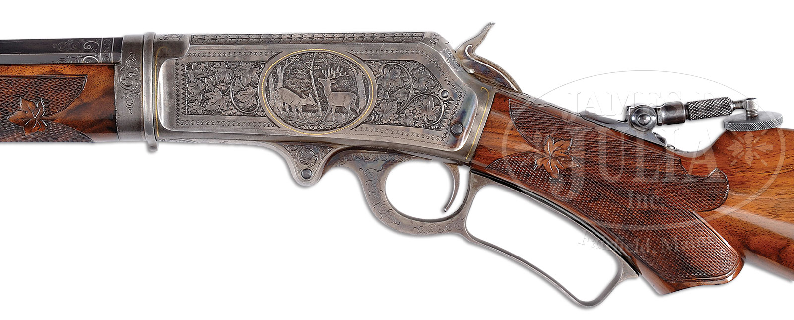 EXTREMELY RARE & IMPORTANT MARLIN MODEL 1893 TAKEDOWN LEVER ACTION RIFLE RELIEF ENGRAVED WITH GOLD & PLATINUM INLAY.SN 139494. Cal. 30-30. Fantastic, special order, takedown, deluxe engraved rifle with 26″ oct to rnd bbl, half magazine, half nickel front sight & semi-buckhorn rear sight with Lyman loop tang sight with large disk. Manufactured February 18, 1897. Receiver is wonderfully semi-relief engraved in #10 patterns by Conrad Ulrich with large vignettes of a bull and cow elk in a very detailed woodland scene on left side and a very highly detailed bust of a grizzly bear on right side. Left side vignette has a fine gold rope border and right side vignette has a solid gold wire border. Both sides of receiver have large coverage grape leaf, berry & vine pattern engraving with an extremely fine shaded background. Both sides have Ulrich’s typical curlicue borders with larger feather style borders around top flats. Side of bolt is engraved with grape leaf and berries with a small rnd vignette that has a gold wire inlay. Sides of lever boss also have leaf & vine patterns. Front & rear edges of receiver have gold wire inlay with inlaid platinum wire on sides of hammer and with wire and curls in platinum over chamber area of bbl. Forend cap, sides of takedown ring and top front of receiver have fine arabesque pattern engraving & there is a platinum wire inlay around forend cap. Sides of lever and down top tang have light arabesque pattern engraving. Mounted with extremely beautiful burled walnut stock and pistol grip with serpentine grip cap, 12-3/4″ over the orig Marlin hard rubber buttplate. Stock and forend cap have sling eyes. This rifle is pictured on p. 347 of Steel Canvas, Wilson. Pattern #10 engravings with a combination of gold and platinum inlay are extremely rare and considered the highest form of decoration ever on an American manufactured firearm. PROVENANCE: Ex-Carl Press Collection; Ex-Clarence Parks Collection; Ex-Wes Adams Collection. CONDITION: Very fine to extremely fine. Bbl retains about 94-96% strong bright orig blue, slightly thinned & turning plum on rnd section & over chamber area. Magazine tube retains about all of its strong bright orig blue. Receiver retains about 80% orig case colors, mostly faded but strong & bright in sheltered areas. Lever retains about 50% orig case colors, strong & bright in sheltered areas, faded elsewhere. Hammer retains 75-80% strong orig case colors, mostly on sides. Wood is sound & retains about all of an extremely fine piano varnish finish. Mechanics are crisp, strong bright shiny bore. 50412-16 (20,000-40,000) – Lot 1116 Click here to view provenance
