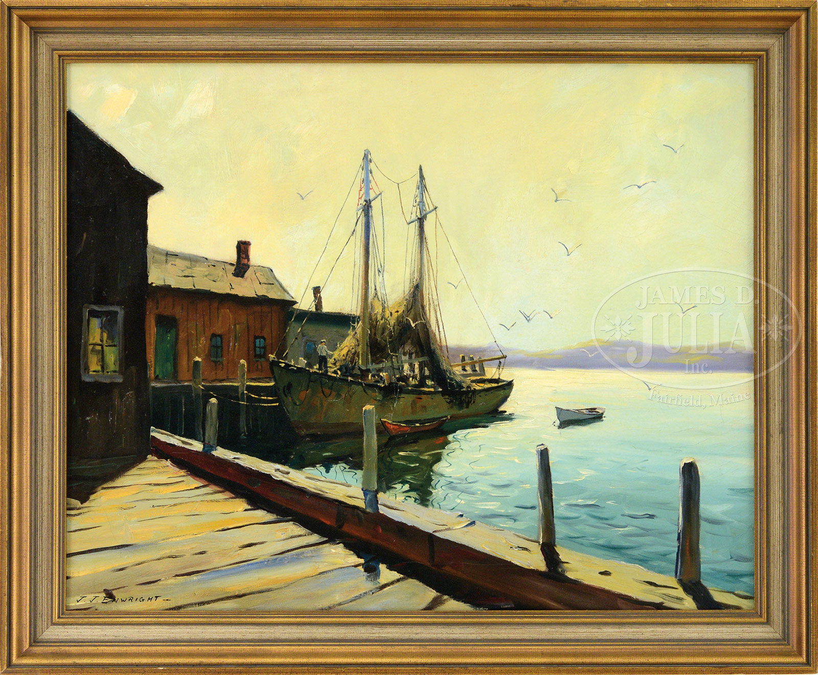 C. HJALMAR AMUNDSEN (American, 1911-2001) FISHING TRAWLER AT DOCK.Oil on canvas Housed in a modern bronze painted wood frame Signed lower left “J.J. Enwright-” Note: J.J. Enwright is a pseudonym for “Cappie” Amundsen SIZE: 24″ x 30″. Overall: 28-1/2″ x 35″. CONDITION: Good with yellowed varnish and craquelure. 52099-5 (1,000-1,500) – Lot 1116