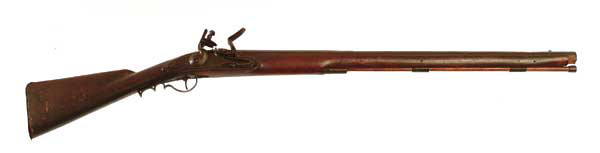 MODIFIED FLINTLOCK MUSKET NSN. Cal .80, 30-5/8″ part-oct. bbl, 7″ banana lockplate. Bbl has been shortened, the nose tip is missing, the ramrod is replaced. CONDITION: Heavy rust-brown patina overall. Stock has been heavily sanded and refinished. 4-47430 FS312 (300-700)