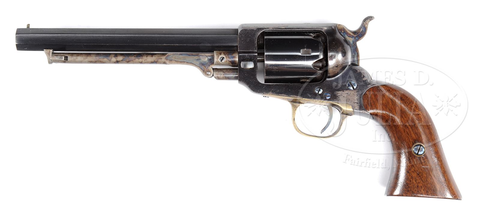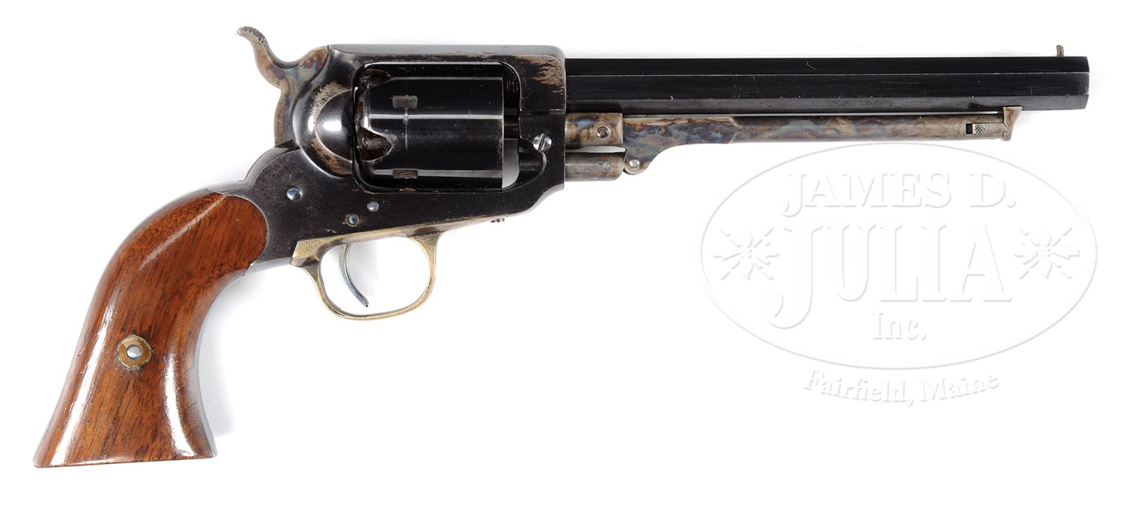 CIVIL WAR WHITNEY POCKET MODEL PERCUSSION REVOLVER.SN 21478K. This late 2nd model Whitney Percussion Revolver was made during the Civil War era and appears in very fine condition retaining much of its apparent refinished blue and case colors. Gun conforms to other pockets being 31 Cal., 5-shot rnd cylinder. 6″ oct bbl, 2-pc walnut grips. PROVENANCE: The Estate Collection of Phil A. Bleakney, Jr. CONDITION: Excellent overall. All matching including grips and loading arm. Apparent re-glue is 99% intact on bbl, 95% on frame with largest reductions on backstrap, and 98% on cylinder with light drag line. Case colored hammer and loading assembly retain virtually all of their bright, apparent refinish. Grips are sound, solid and well fit retaining 98% of their varnished finish. 49059-132 JS (2,000-3,000) – Lot 1117