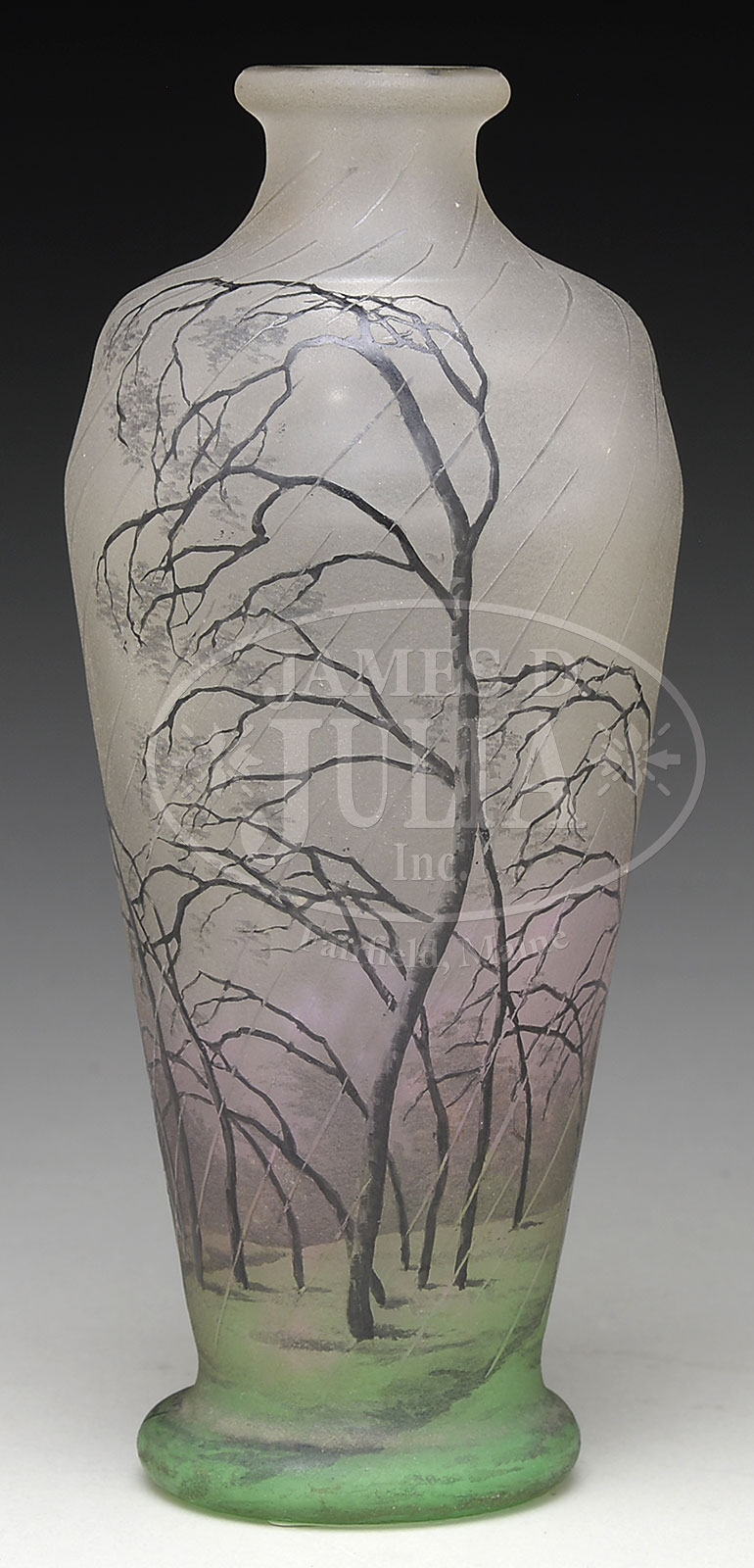 DAUM NANCY RAIN SCENE VASE.Daum shouldered vase with flared rim is decorated with cameo and enamel barren forest scene with diagonal rain drops, against a green, pink and clear acid textured background. Signed on side of foot with black enameled “Daum Nancy” and Cross of Lorraine. SIZE: 7-1/2″ t. PROVENANCE: From an Unreserved Texas Estate. CONDITION: Very good to excellent. 51362-29 (4,000-6,000) – Lot 1117