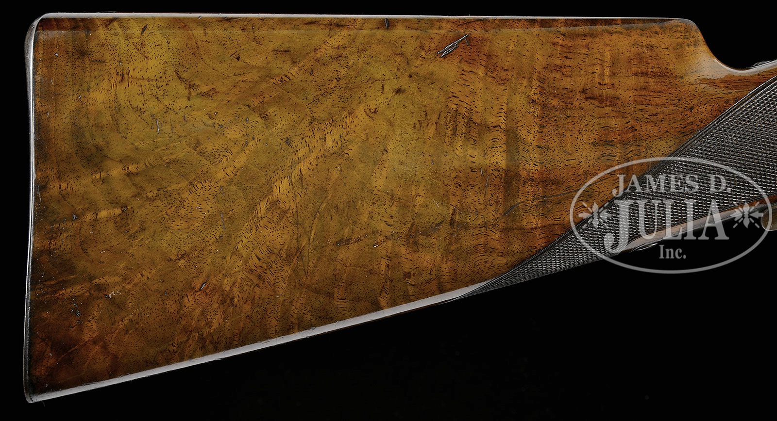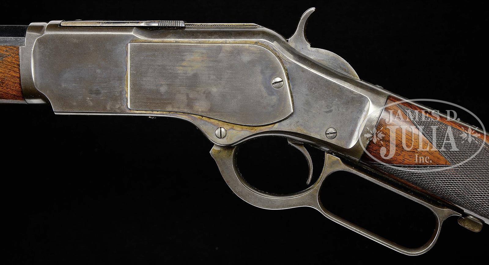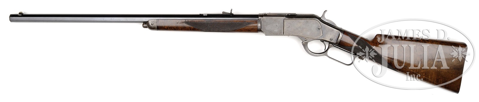 SCARCE DELUXE WINCHESTER MODEL 1873 LEVER ACTION RIFLE.SN 135098. Cal. 32 WCF (32-20). Beautiful deluxe rifle with 24-1/4″ oct bbl, button magazine, half-nickel front sight & semi-buckhorn rear sight. Mounted with highly figured, center crotch American walnut with H-style checkered forearm and straight grip with smooth steel shotgun buttplate. Left side of lower tang, under the wood is marked with the assembly number “5077”, “XXX”, “32” & an “S”. This rifle will letter from the Cody Firearms Museum records office as it is found here except the records show that it had checkered pistol grip stock versus the currently mounted checkered straight stock. The assembly numbers found on the buttstock & buttplate show that this stock is orig to this rifle and that the records entry is obviously a mistake. Receiver is small bore style with stepped receiver ring and milled rail with 3rd type dust cover. In addition to being scarce deluxe configuration, this rifle is additionally scarce in that it has a color case hardened receiver in Cal. 32. This rifle was produced in about 1883 when the west was still wild and firearms were working tools. Hunting was a way of life as well as using a rifle for self-protection. Most of the firearms of that era generally saw very hard & continuous service under harsh circumstances and are rarely found today with high orig finish. Undoubtedly this rifle was owned by a gentleman hunter or perhaps a lady. CONDITION: Very fine. Bbl retains 95-97% strong bright orig blue; receiver retains 40-50% orig case colors, strong & bright on the right side, more muted on the left side with the balance a smooth plum patina; wood is sound with minor nicks & scratches and retains about 95% of orig piano varnish finish that has been waxed; buttplate retains 90-92% bright orig blue with wear at the heel & toe with some fine pitting. Good mechanics, bright shiny bore with one little area of light rust about mid-point. 4-51486 JR291 (6,000-10,000) – Lot 1118