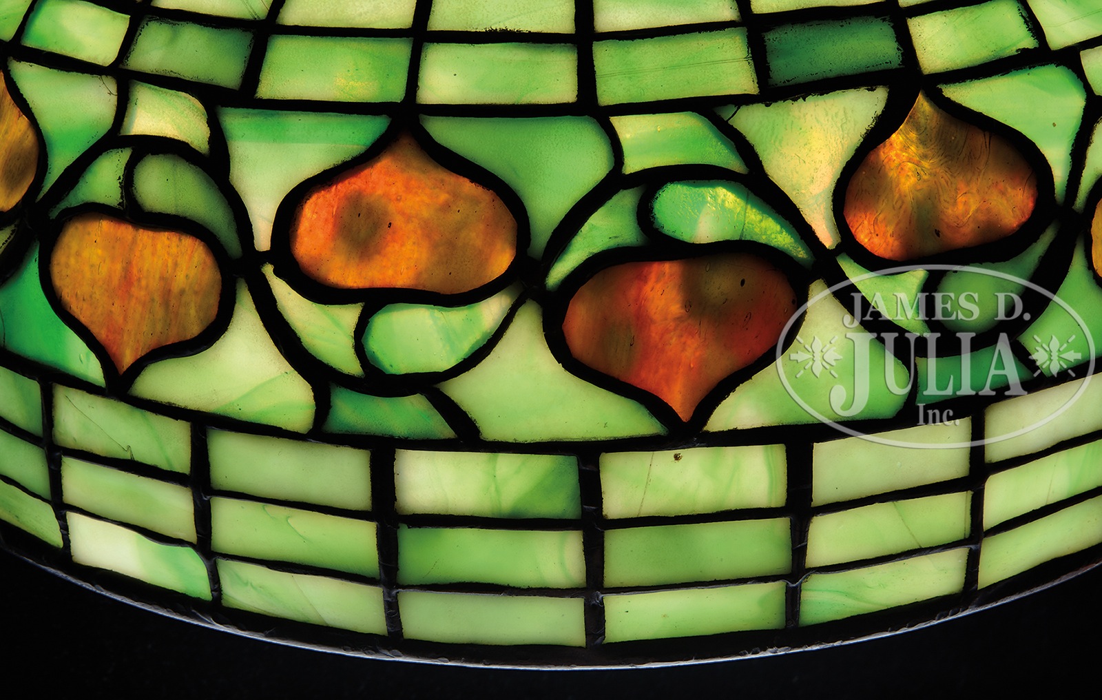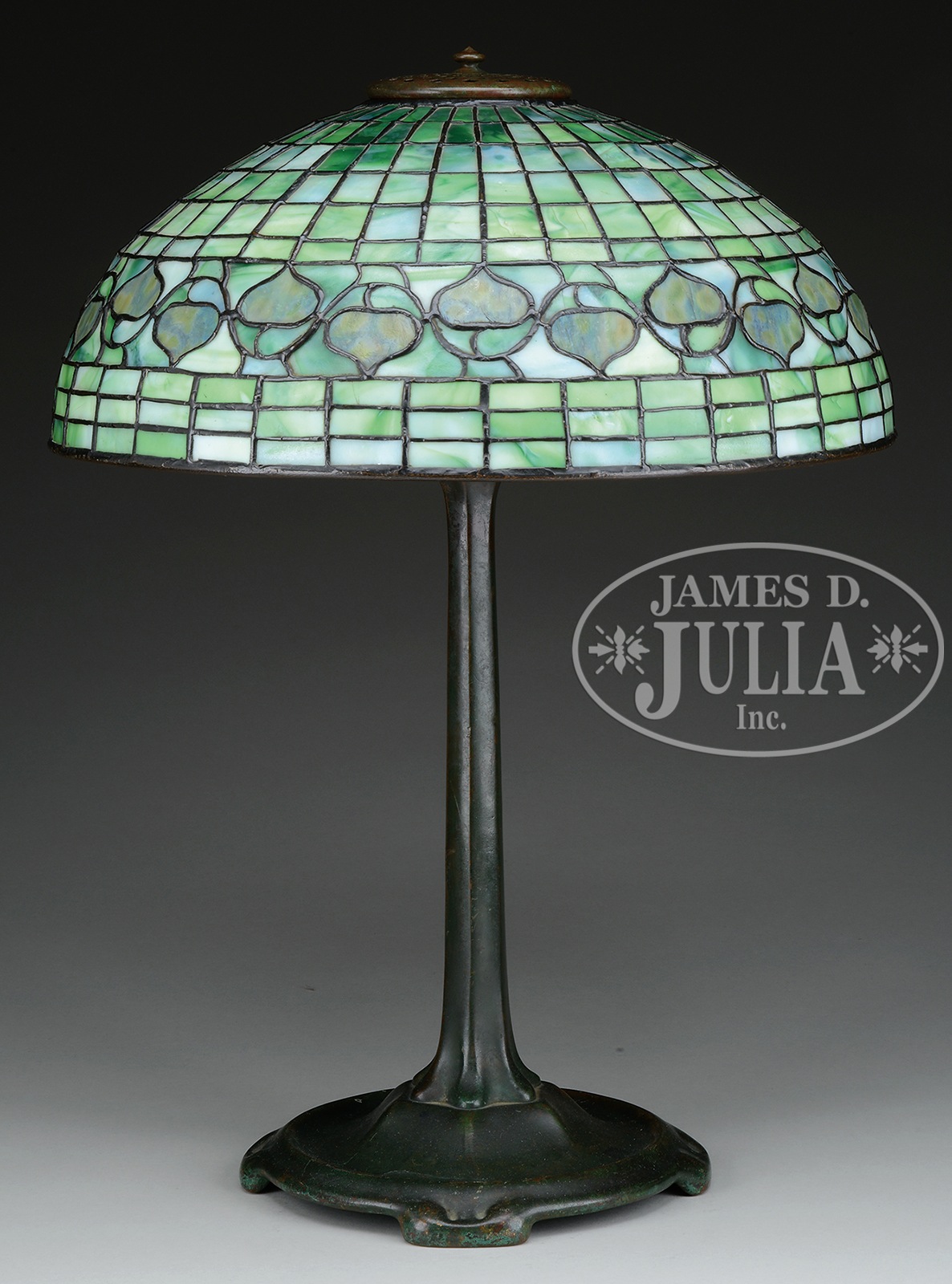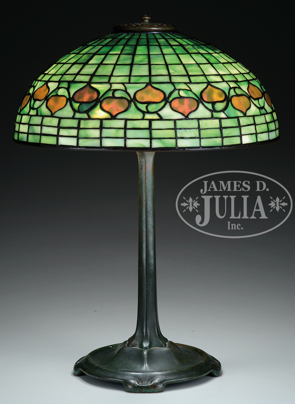 TIFFANY STUDIOS ACORN TABLE LAMP.Tiffany Studios table lamp has leaded shade with green geometric paneled background and a band of dichroic glass acorns that are mottled green when unlit and orange when lit. Shade is signed on the inside lip with small tag “Tiffany Studios New York”. It rests on a simple stick base with 3-socket cluster and replacement heat cap. Base is finished in a dark brown patina with green highlights and is signed on the underside “Tiffany Studios New York 533”. SIZE: Shade is 15-3/4″ dia. Lamp is 22″ t. CONDITION: Shade is very good to excellent with only a few tight hairlines. Base is very good to excellent with some minor wear and discoloration to patina, rewired with contemporary plastic cord. 1123-1 (6,000-8,000) – Lot 1119