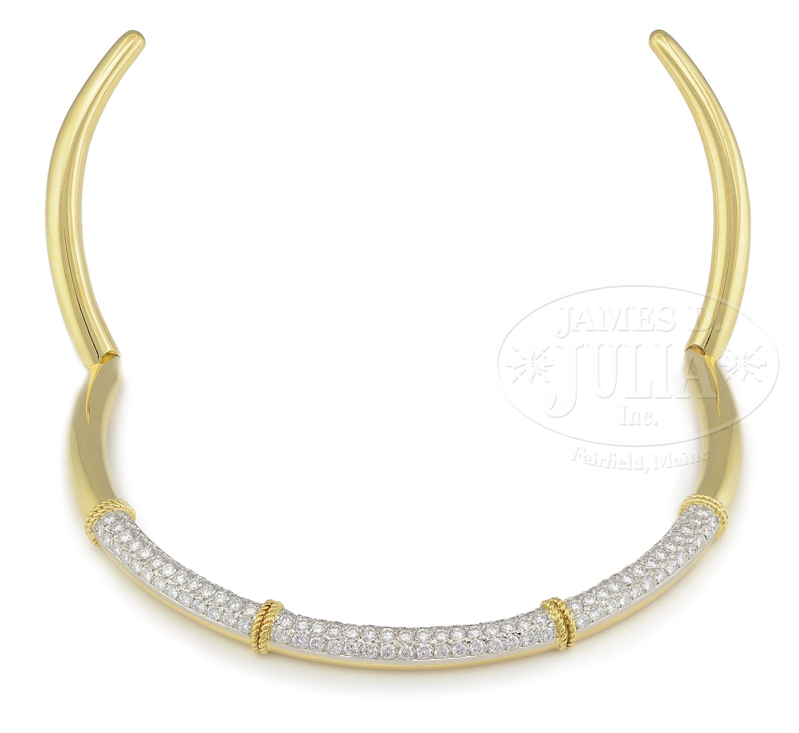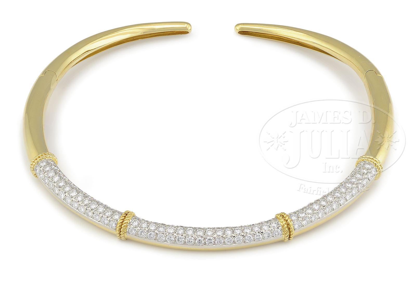 18kt yellow gold choker diamond necklace is set with 124 round brilliant cut diamonds weighing approx 6.95cttw. Color is F-G and clarity is VS. Choker has a hinge on each side for ease of putting on and off. Stamped on the reverse “Fred Paris 18KT France”. Overall 40.50dwt. SIZE: 12-1/4″. Opening is 1/2″ in back which expands to 3-1/2″. CONDITION: Very good to excellent. 50367-10 (8,000-10,000) – Lot 1119