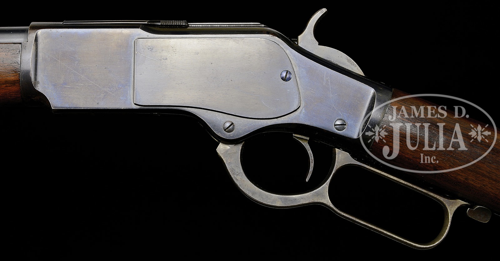 *WINCHESTER MODEL 1873 3RD MODEL LEVER ACTION MUSKET.SN 571049. Cal 44 WCF (44-40). Standard 3-band musket with 30″ bbl, full magazine, square base front sight/bayonet lug and 900 yd musket ladder rear sight. Mounted with very nicely figured, uncheckered, straight grain American walnut with straight stock & carbine/musket buttplate with trap. There were about 721,000 Model 1873 firearms produced and according to the referenced publication only 5% were muskets. Extrapolation of those figures shows that there were only about 36,000 muskets produced. CONDITION: Extremely fine. Bbl & magazine tube contain 98-99% strong orig blue and the receiver 88-90% glossy orig blue with the loss areas flaked, not worn, to a light patina with some light candy striping. Lever retains most of its orig case colors, strong on the sides, turning silver on the outer faces. Hammer retains brilliant case colors. Wood is sound with a couple of very minor storage & handling nicks and retains virtually all of its brilliant oil finish. Loading gate retains about all of its bright fire blue. Mechanics are crisp, brilliant shiny bore. Appears to be unfired. 4-47828 JR117 (5,000-8,000) – Lot 1120