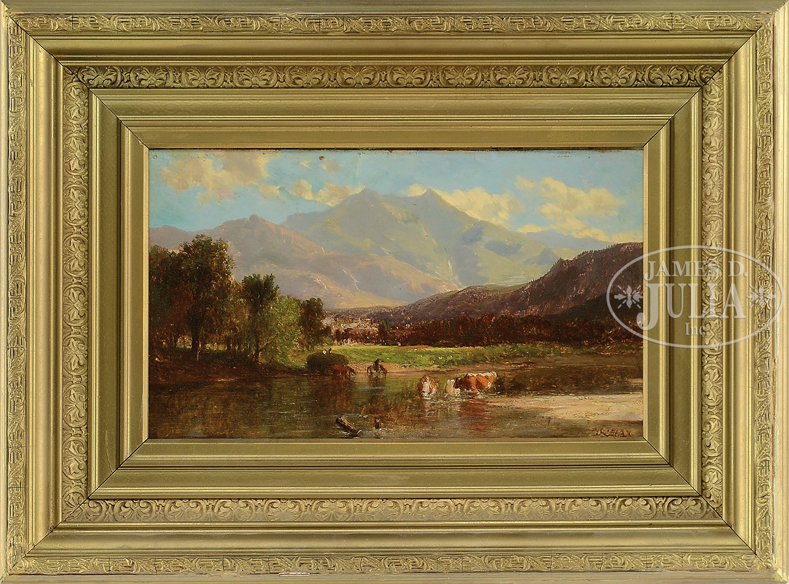 SAMUEL LANCASTER GERRY (American, 1813 – 1891) MT WASHINGTON NEW HAMPSHIRE.Oil on board Housed in its original gesso decorated gilt frame Signed lower right SIZE: 9″ x 14-1/2″. Overall: 16″ x 21-1/2″ CONDITION: Very Good, some spot touch up 9-93579 (3,000-5,000) – Lot 1121