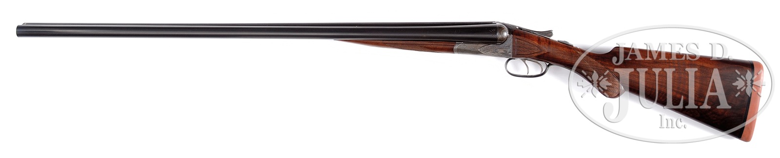 *RARE EARLY A H FOX B GRADE EJECTOR 12 GAUGE SHOTGUN.SN 15974. Cal. 12ga. Chambers measure 2-3/4″. 30″ Krupp marked bbls with wide matted rib, choked Full/Full, sgl steel front bead, splinter forend with Anson & Deeley release. Early style B grade engraving featuring sgl game birds encased in fine scroll work on action sides. Fine scroll work on body borders, trigger guard and top lever. Early style ejectors. Dbl triggers. Gorgeous dark streaked walnut with handsome figure, semi-pistol grip, checkered side panel, measures 14-1/2″ LOP over solid red rubber pad. DAC 1-1/2″, DAH 2-1/4″. Automatic safety. PROVENANCE: Remarkable William Larkin Moore Private Estate Collection of Fine Sporting Arms. CONDITION: Fine as partially restored. Bbls retain most of what appears to be it’s orig factory finish. Bbl markings and engraving are crisp. Action retains areas of visible case hardening, vibrant in protected areas and thinning on contact points. Engraving remains clean. Screw heads in fine shape. Trigger bow retains a majority of it’s orig high lustre blue finish. Top lever right of center. Wonderfully restored wood finish with sharp correct B grade style checkering pattern on both stock and forend. Slightly evident two professionally repaired hairline cracks at back of forend. Ejectors strong and in time. This gun is tight and opens and closes like a vault in Fox fashion. This is an early one shipped September 1910. 50595-6 TJW (1,500-2,500) C&R – Lot 1121