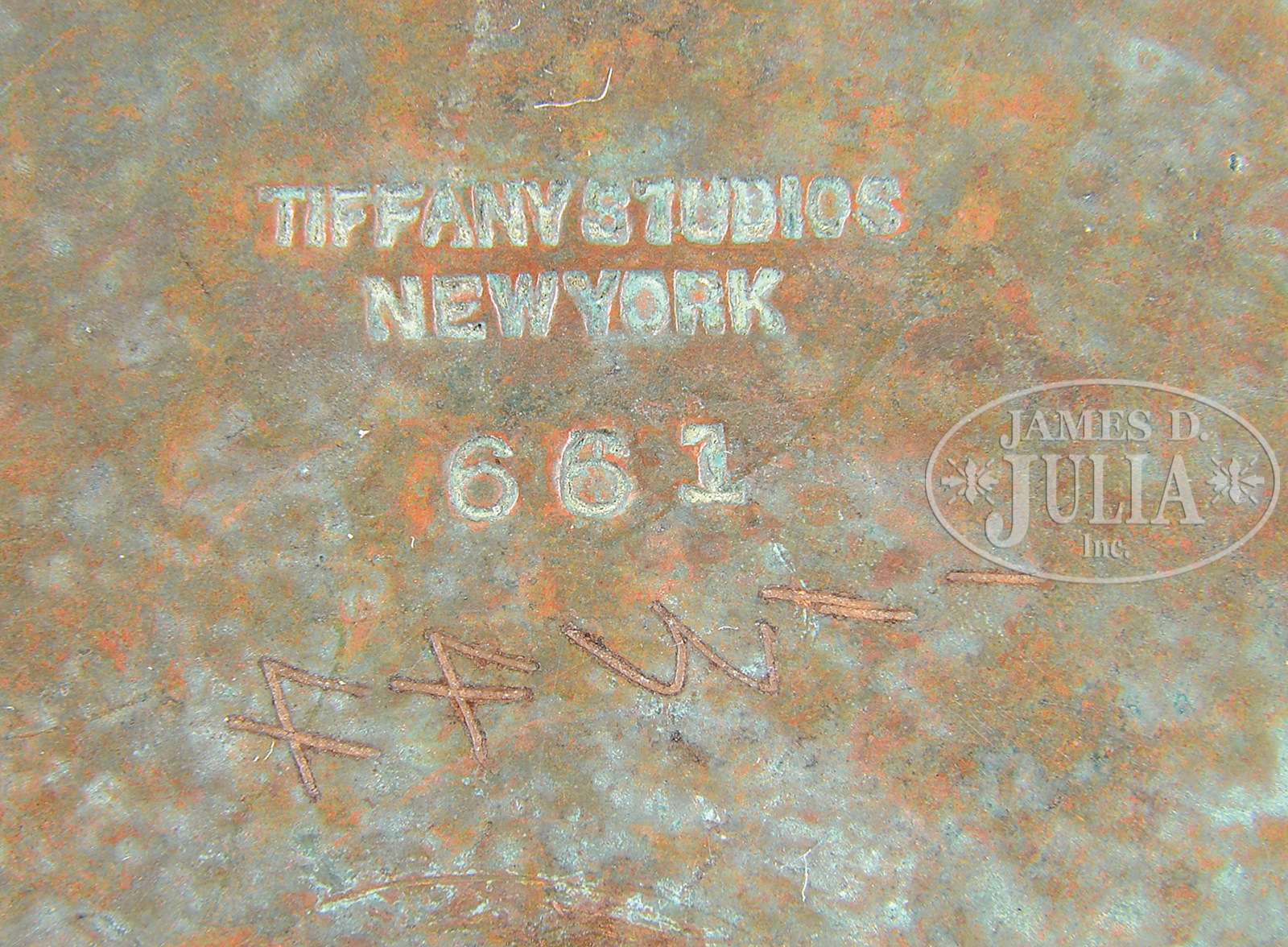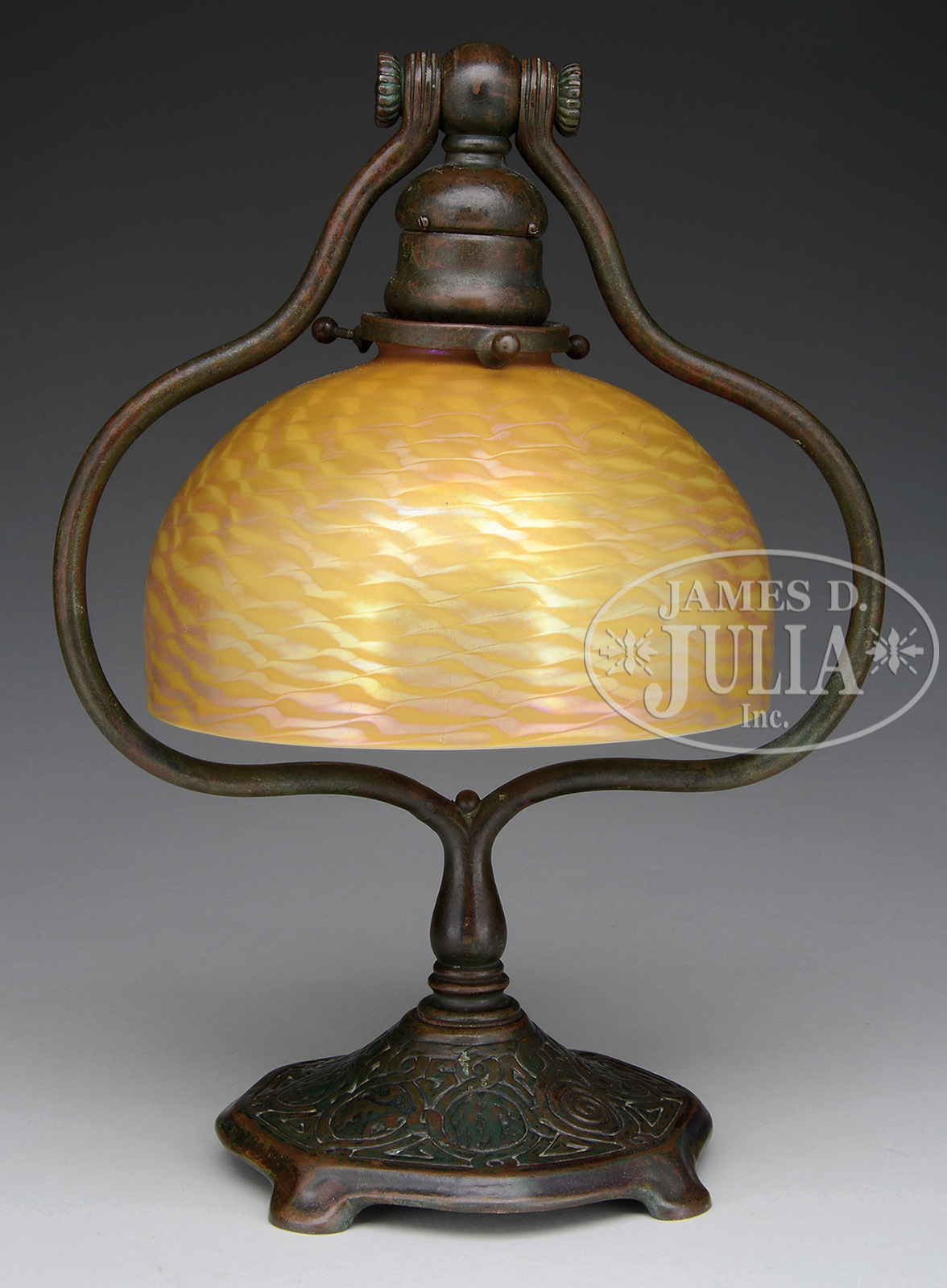 TIFFANY STUDIOS ZODIAC DESK LAMP.Tiffany Studios desk lamp has cast bronze base with Zodiac pattern surrounding the foot. Bronze harp houses a rich gold iridescent damascene shade showing nice pink and platinum highlights. Bronze base is finished with a rich brown patina with green highlights. Base is signed on the underside “Tiffany Studios New York 661”. Shade is signed in the fitter “L.C.T. Favrile”. SIZE: Shade 7″ dia. Lamp 13″ t. CONDITION: Very good to excellent. Base is rewired with appropriate cloth cord. 48971-4 (5,000-7,000) – Lot 1123