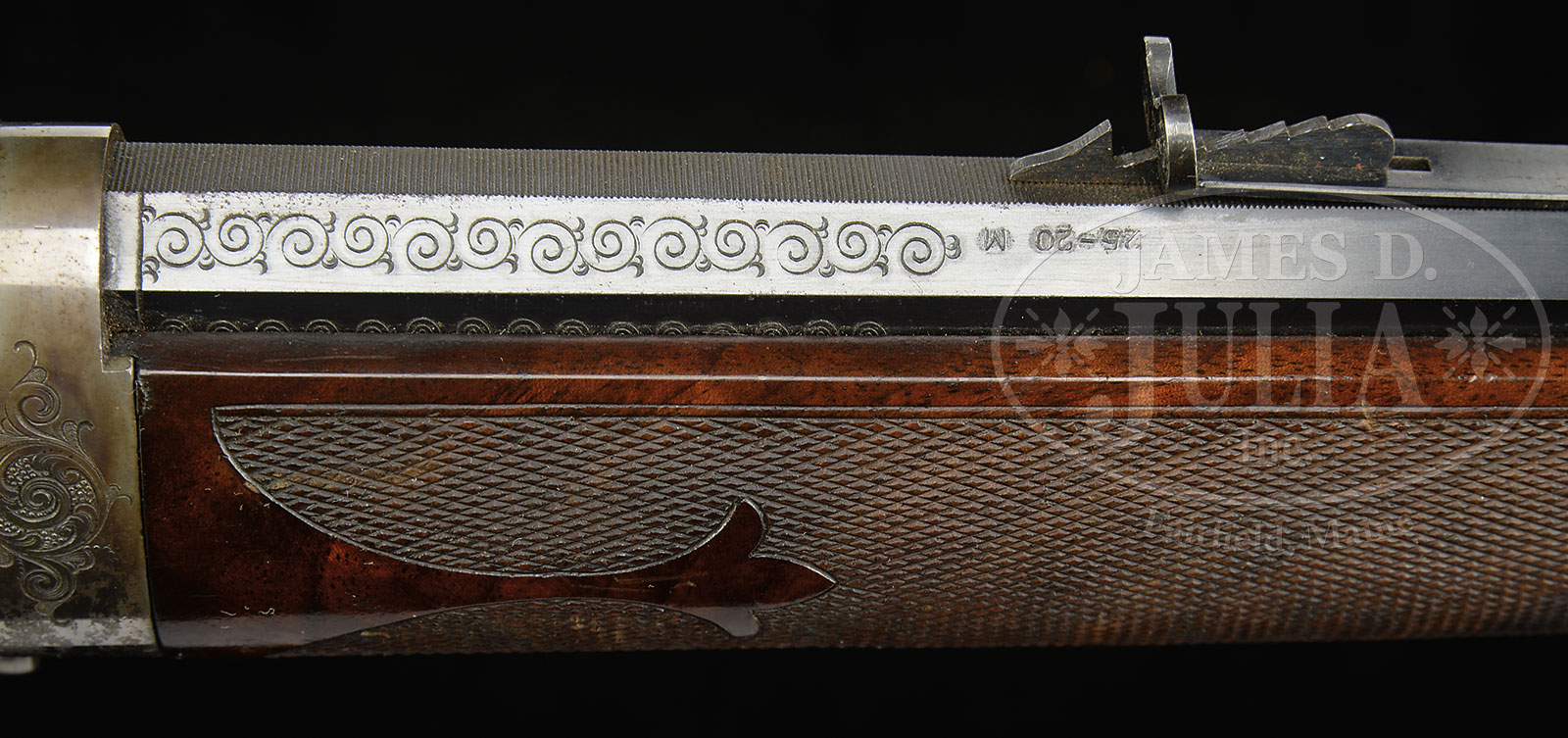 *RARE FACTORY ENGRAVED SPECIAL ORDER MARLIN MODEL 1894 TAKE DOWN LEVER ACTION RIFLE.SN 347340. Cal 25-20. Beautiful deluxe Marlin with 24″ tapered oct bbl, full magazine, Lyman front sight, missing its bead, semi buckhorn rear sight and a locking Lyman tang sight with duplex aperture. Top flat of bbl is full length matted. The matting on the top flat of bbl has completely covered the address. Cal marking is on the top right flat by the rear sight. Receiver & lever are color case hardened. Receiver is beautifully engraved by Conrad Ulrich in number 5 style which consists of the large oval vignette of a standing Bull Elk & cow in a very detailed forest scene all surrounded by wonderful executed foliate arabesque patterns that have pearled background. Border patterns are arrow heads and wavelets. Right side is engraved in matching foliate arabesque patterns and borders. Light engraving extends over the top side flats of the bbl chamber area. Matching foliate arabesque patterns are also found on the take down bbl extension, forend cap, top & bottom of the receiver and top tang. Mounted with very highly figured American walnut that is checkered in “C” style on the forearm and pistol grip. Buttplate is Marlin embossed hard rubber. Left side of upper tang & top tang channel of the buttstock are marked with matching SN to the rifle. Buttstock & forend cap have factory sling swivels. This rifle appears to have been produced in about 1905 and likely was purchased for a lady or young man. CONDITION: Very fine, all matching. Bbl & magazine tube retain about 98% crisp orig blue and the forend cap about 95%. Receiver retains 60-70% orig case colors, strong & bright in sheltered areas fading elsewhere. Take down bbl extension retains about 60% fading case colors and the lever about 40% case colors, strong on the left side. Hammer retains most of its orig blue. Wood is sound with a few light nicks and shows an old added finish on the buttstock with the forearm retaining most of its orig varnish. Mechanics are crisp, bright shiny bore. 51457-1 JRL (10,000-15,000) C&R – Lot 1123
