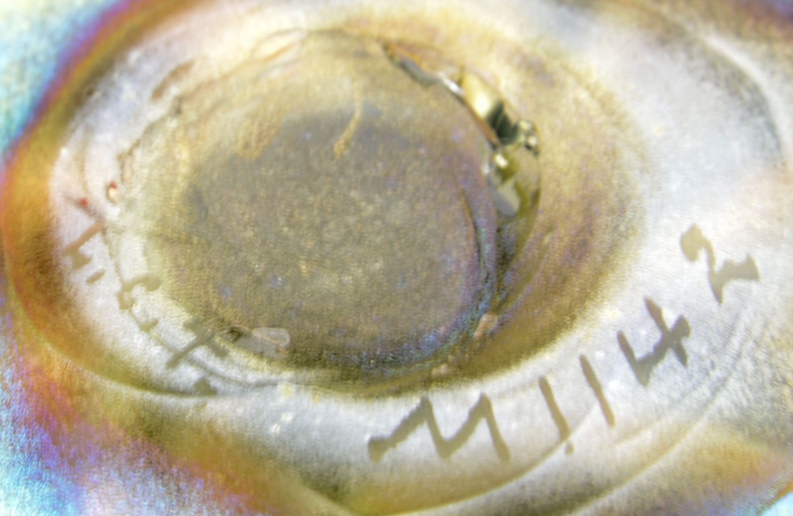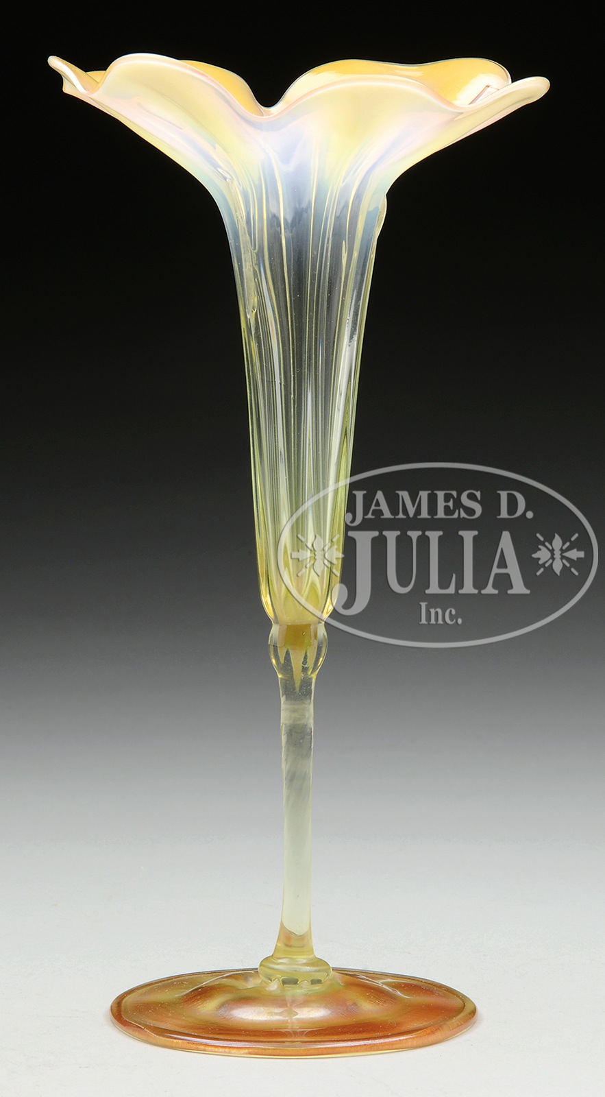 TIFFANY FAVRILE GLASS FLOWER FORM VASE.Tiffany favrile glass flower form vase has inverted saucer foot with thin stem leading to the vertically ribbed body of the vase with wide flaring ruffled rim. The vase is done in a pale green glass with light gold iridescence with a white opalescent rim. Signed on the underside “L.C.T. M1142”. SIZE: 10-3/4″ t. CONDITION: Very good to excellent. There is an extra wide thread of glass on the interior of the vase from the making. 1095-7 (2,500-3,500) – Lot 1124