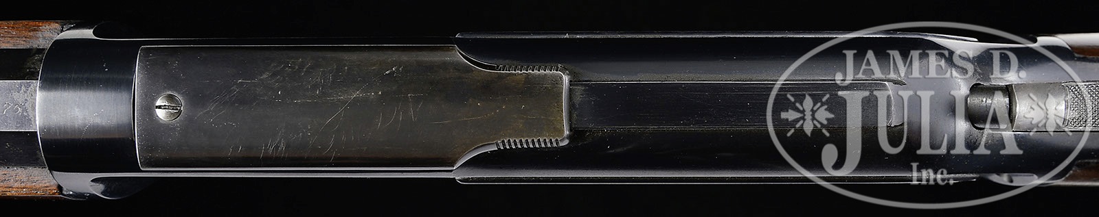 WINCHESTER MODEL 1876 LEVER ACTION RIFLE.SN 44859. Cal. 45-75. Standard grade rifle with 28″ oct bbl, full magazine, half nickel front sight and “1876” marked ladder rear sight. Receiver is 3rd type with integral rail and 3rd type dust cover; mounted with nicely figured, slab sawed, uncheckered American walnut with straight stock and crescent buttplate that has trap containing an orig 4-pc all steel cleaning rod; buttstock and forend cap have factory sling swivels. This rifle was produced in about 1884 during the height of the Great Westward Expansion when repeating arms were in tremendous demand. The model 1876 was the first “big” caliber available to this market and therefore was very popular on the frontier until the advent of the more modern high power cartridges chambered by Marlin in their Model 1881 and then by Winchester in the model 1886. Only about 63,871 of these scarce rifles were produced in the period 1876-1898 making this one of Winchesters lowest production lever action rifles. PROVENANCE: Robert H. Haskell, III Estate Collection. CONDITION: Extremely fine. Bbl retains 95-97% strong orig blue with only faint sharp edge wear, a few spots of minor flaking and a few scattered spots of surface discoloration. Magazine tube retains 92-93% orig finish, turning a little plum with two fingerprint sized spots of surface etching; receiver, side plates & dust cover retain 98-99% strong orig blue with some very minor, light surface dulling on the left side, showing only faint sharp edge wear; lever & hammer retain dark case colors; buttplate retains 97-98% crisp orig blue. Wood is sound with a few minor nicks and retains about 98% crisp orig finish. Mechanics are crisp. Brilliant shiny bore; may be unfired, bolt face and loading gate retain virtually all of their orig finish. Cleaning rod is fine. 4-50200 JR32 (6,000-10,000) – Lot 1126