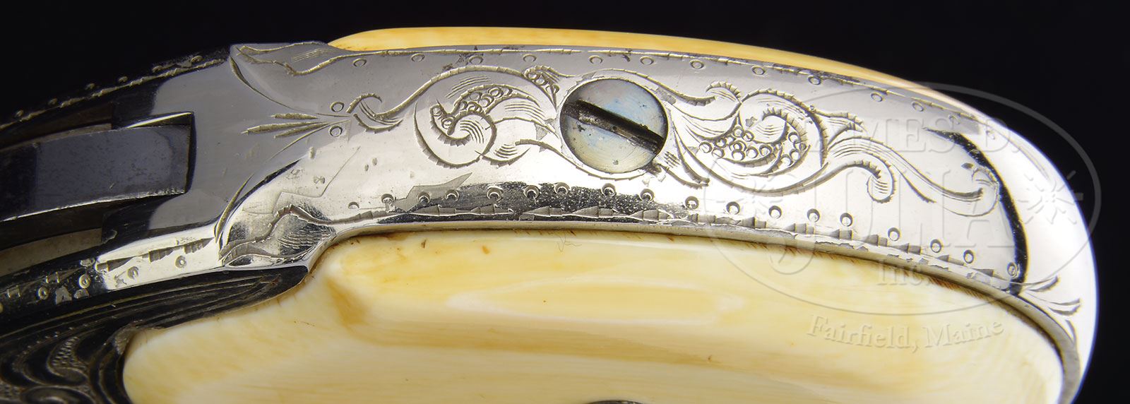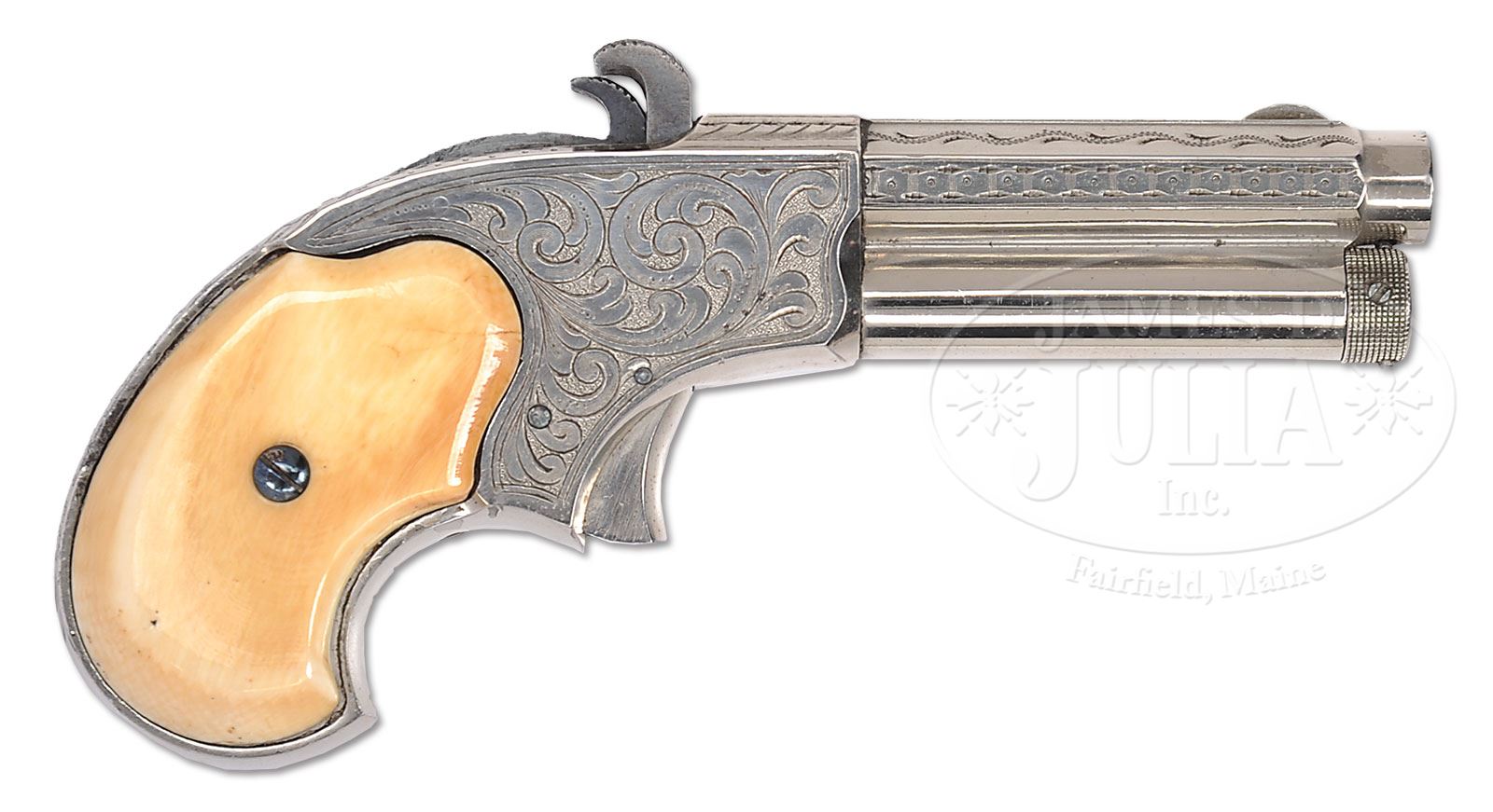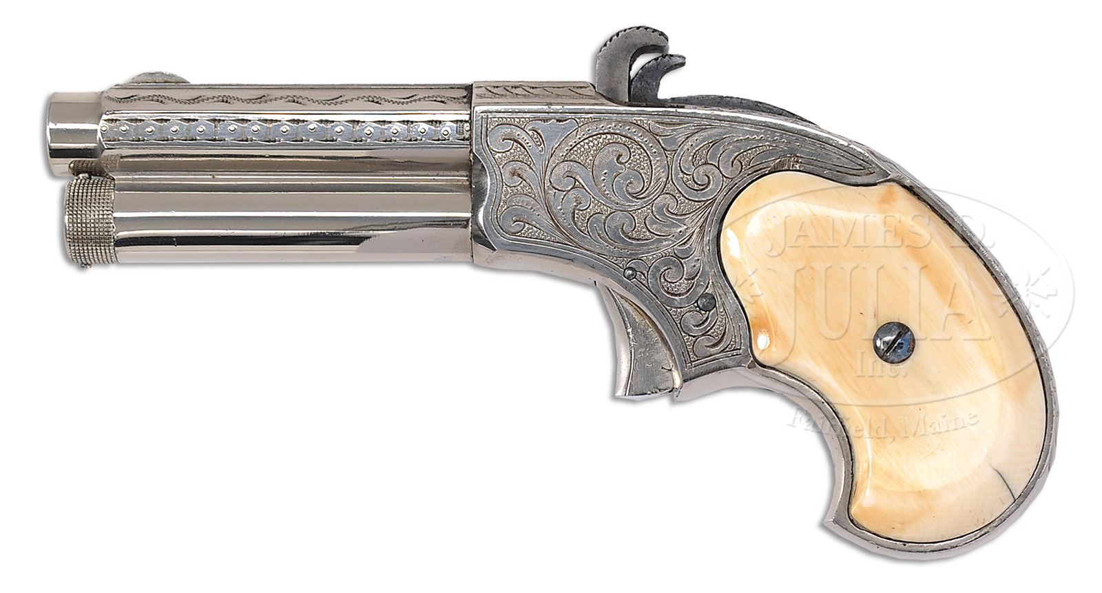 RARE ENGRAVED REMINGTON-RIDER MAGAZINE PISTOL.Cal. 32 RF Extra Short. Nickel finish with 3-1/4″ oct bbl, half moon front sight and mounted with smooth 2-pc certifiable antique ivory grips. Pistol is engraved in New York style, probably from the L.D. Nimschke shop in flowing foliate arabesque patterns with pearled background. Top side flats of bbl are engraved in leaf & vine pattern with square & dot patterns on side flats which are also engraved on top flat of receiver. Back strap is engraved in matching foliate arabesque patterns. There were perhaps as many as 15,000 of these little pistols produced in the period 1871-1888 many of which were engraved. This was the first production cartridge pistol to use a tubular magazine. These little pistols were popular with ladies & gamblers and gentlemen as pocket pistols. They are rarely found today with high orig finish. Special Note: This item contains or is made of ivory. Do not bid on this lot unless you have read and agreed to our“Ivory Position Statement”and the “Waiver of Legal and Financial Risk to James D. Julia in regards to your Purchase of an Ivory Object”. This information is located in our catalog on pages 30 and 31. PROVENANCE: The Elliott Burka Estate Collection. CONDITION: Extremely fine. Overall retains about 98% crisp orig nickel with one small spot on the frame above the left grip; breech block retains bright case colors and the hammer strong fire blue. Left grip has an age line, otherwise they are sound with no other visible flaws and retain a golden ivory patina; grip screws retain about all of their orig fire blue. Mechanics are crisp, strong bore with moderate pitting. 4-56524 JR140 (3,500-5,000) – Lot 1126