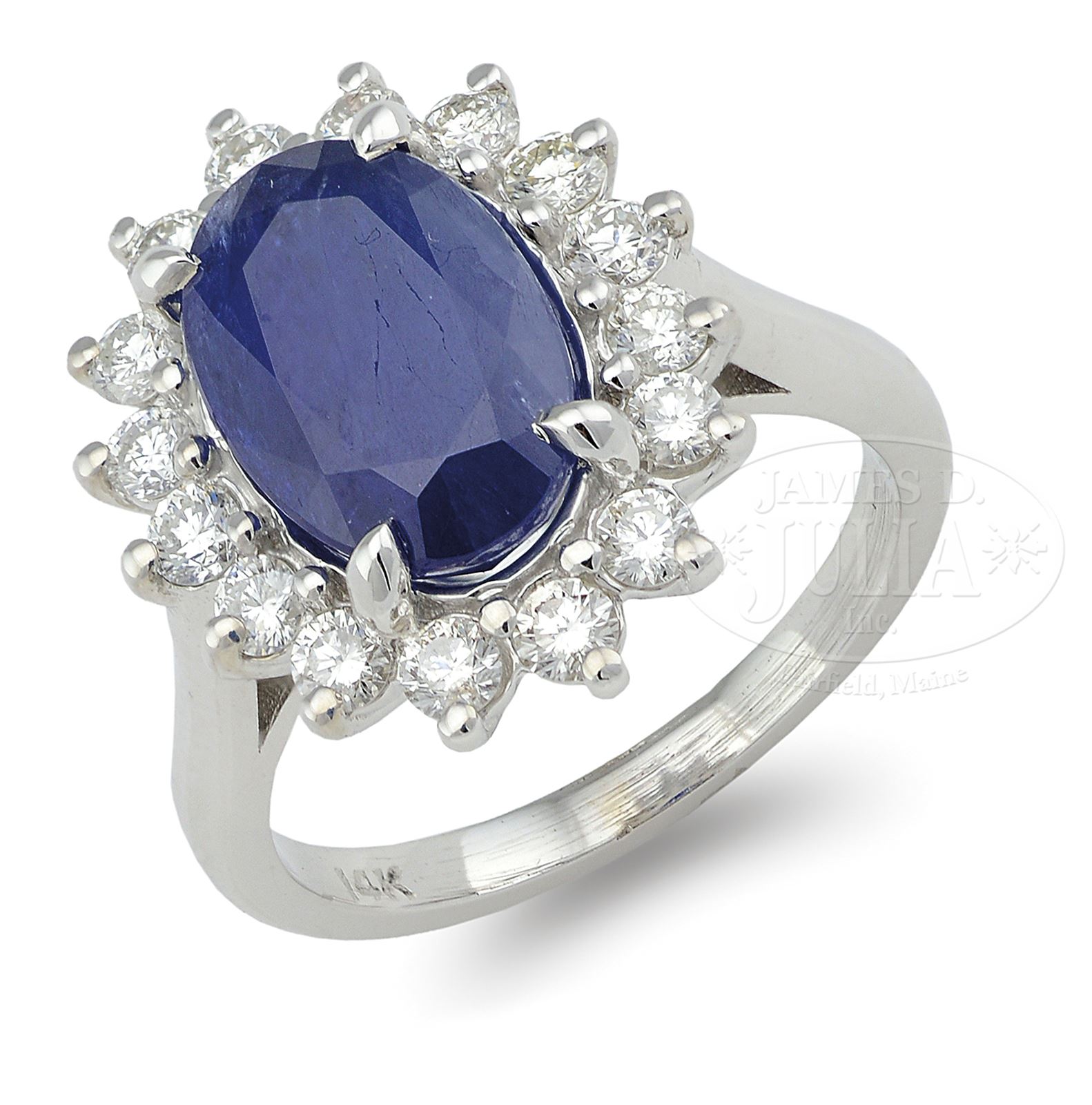 Centered by an oval cut sapphire surrounded by round brilliant cut diamonds in a 14kt white gold mount. Sapphire is accompanied by AGL Cert stating that it is a natural Burma sapphire weighing 5.13ct with no heat enhancement. There are sixteen round brilliant diamonds with an approx total weight of 0.96cttw. Ring is stamped “14K” and ring comes with box. SIZE: 6-3/4. CONDITION: Very good to excellent. 50452-7 (9,500-11,500) – Lot 1126