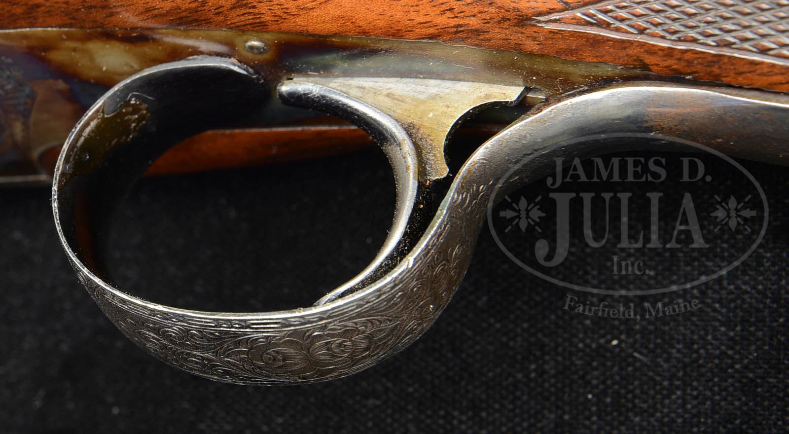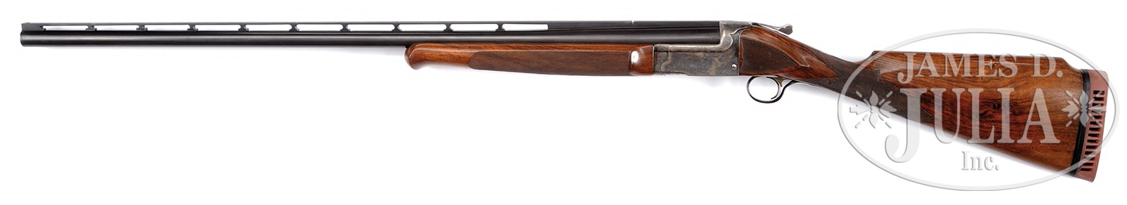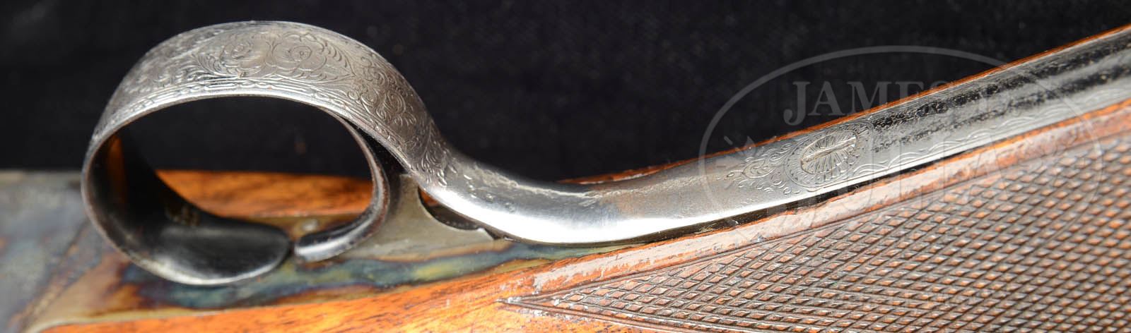 *RARE L.C. SMITH CROWN GRADE SINGLE BARREL TRAP GUN.SN S115083.C. Cal. 12 ga. 32″ bbl, ventilated rib, 2-3/4″ chamber, Full choke. Twin beads. Wedding band engraving at muzzle, engraved wedges at breech. Bbl engraved “L.C. SMITH CROWN TRAP” on right side, “MADE TO ORDER BY THE HUNTER ARMS CO INC FULTON NY” on left side. Trap style beavertail forend with schnable tip, blued banjo release, forend iron case colored. Auto ejector. Crown Grade fully engraved receiver with vignette left side of two dog hunting scene & right side with oval vignette of two Pointers. Gold inlaid crown on top lever. Long tang trigger bow nicely engraved. Gun is mounted in nicely grained walnut. Checkered straight grip Monte Carlo buttstock with checkered cheeks. Reproduction Hawkins red vented pad. LOP 14-1/2″ over pad. DAC 1-3/8″. DAH 1-5/8″. CONDITION: Very good. Bbl with nicely aged blue with wear at muzzle, breech & forend attachment points. Light pitting under blue. Mirror bore. Receiver & top lever with above average amounts of orig case color with typical wear, mostly on belly & high sides of receiver. Blued trigger guard lightly dented & wavy where trigger joins tang. Nice wood finish which has been enhanced. Sharp checkering with scattered dents. Top lever slightly right. Gun is tight with crisp mechanics. Strong ejector. 50994-13 TJW (3,000-5,000) C&R – Lot 1126