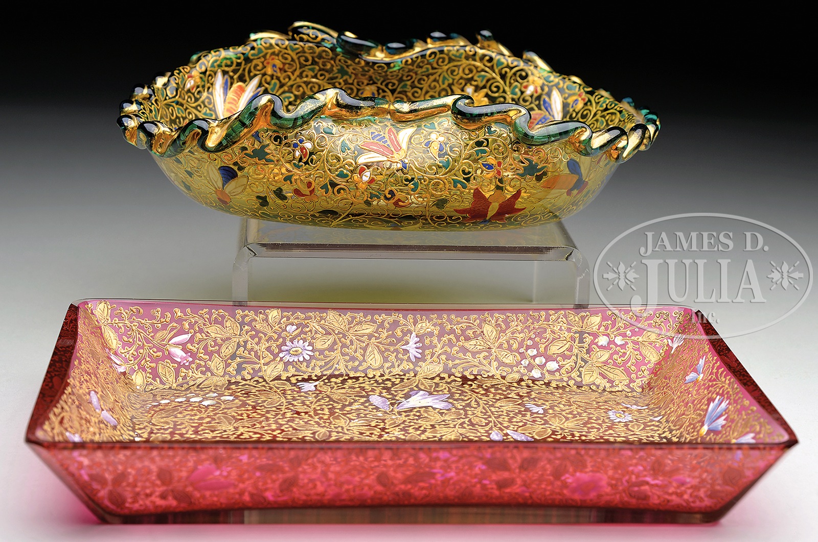 TWO DECORATED MOSER PIECES.1) Decorated Moser bowl has brightly enameled stylized flowers encircled by gold enameled swirling vines with green enameled leaves. Bowl is further decorated with a center enameled butterfly and various other enameled insects encircling the sides of the bowl. It is finished with an applied light blue and gilded rigaree lip. All set against an amber glass body. 2) Moser tray has all over gilded stems and leaves with gold enamel highlights interspersed with brightly colored enamel flowers. Decoration is set against a flashed cranberry glass body. SIZE: 8-1/2″ l x 2-3/4″ t and 9-1/2″ l x 1-1/4″ t respectively. PROVENANCE: George Klabin Collection. CONDITION: 1) Very good to excellent with wear to gilding. 2) Very good with what appears to be a factory grind on one edge prior to flashing. Some very minor roughness to outer lip. 5-67483 (500-700) – Lot 1127