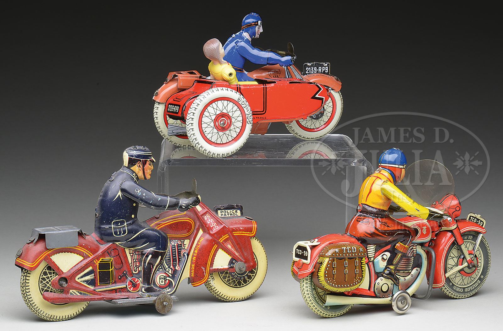 LOT OF 3 EUROPEAN MOTORCYCLES.1) The French cycle depicts a goggled driver and the sidecar houses a jointed female passenger. We are uncertain if she is original to the toy, but she looks great sitting within. The bike is marked “Made in France” with the company logo and “Paris SFA” (Society of Fabrication and Assembly). A really scarce bike in exceptional all original condition with just minimal scuffs. Interestingly enough, the bike has no mechanism and was just a push toy. 2) Very detailed unit manufactured by Tipp. Front wheel is adjustable to control direction. Even more amazing is the original clear plastic windshield is riveted in place and is intact. Again, this is a very scarce bike and a great opportunity to find one in such great condition. Windup is in functional condition. 3)Manufactured by Mettoy (English) is a finely and intricately detailed lithographed cycle. Exterior windup mechanism on left rear side, which is working order. Overall this toy is in very fine condition with some scuffs, most notable to policeman’s arms and left side of body. Otherwise, in very choice condition. SIZE: 6-1/2″ l, 7″, and 8″ l, respectively. PROVENANCE: The Estate of Carol and Jerry Soling. CONDITION: As stated above. Just a nice clean grouping of choice cycles. 1-14792 (600-900) – Lot 1128 Auction: Advertising, Toy & Doll Auction - Fall 2014 Please Note: All prices include the hammer price plus the buyer’s premium, which is paid by the buyer as part of the purchase price. The prices noted here after the auction are considered unofficial and do not become official until after the 46th day. |