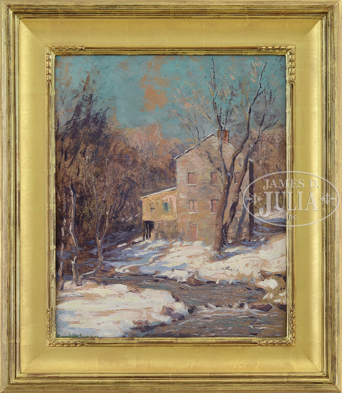 GEORGE GARDNER SYMONS (American, 1863-1930) THE STONE MILL IN WINTER, BRONX, NEW YORK.Oil on board Housed in a giltwood frame Signed lower left “Gardner Symons”, inscribed on verso “Irene Trevekkow(?), Bronxville NY #23″ NOTE: The Lorillard Snuff Mill (currently known as the Lillian and Amy Goldman Stone Mill) is located on the grounds of the New York Botanical Gardens in the Bronx, New York. The mill was built in 1840 along the Bronx River by the Lorillard family and is the oldest existing tobacco manufacturing building in the United States. It was designated a National Historic Landmark in 1976/77 SIZE: 21-3/4″ x 17-1/2”. Overall 29-1/4″ x 25-1/2″ CONDITION: Very good, with scattered retouch 49340-1 (8,000-12,000) – Lot 1128