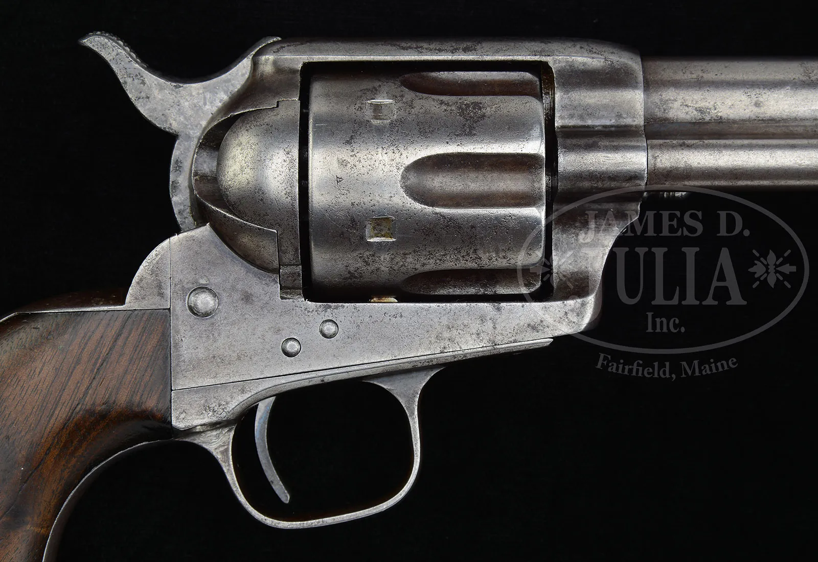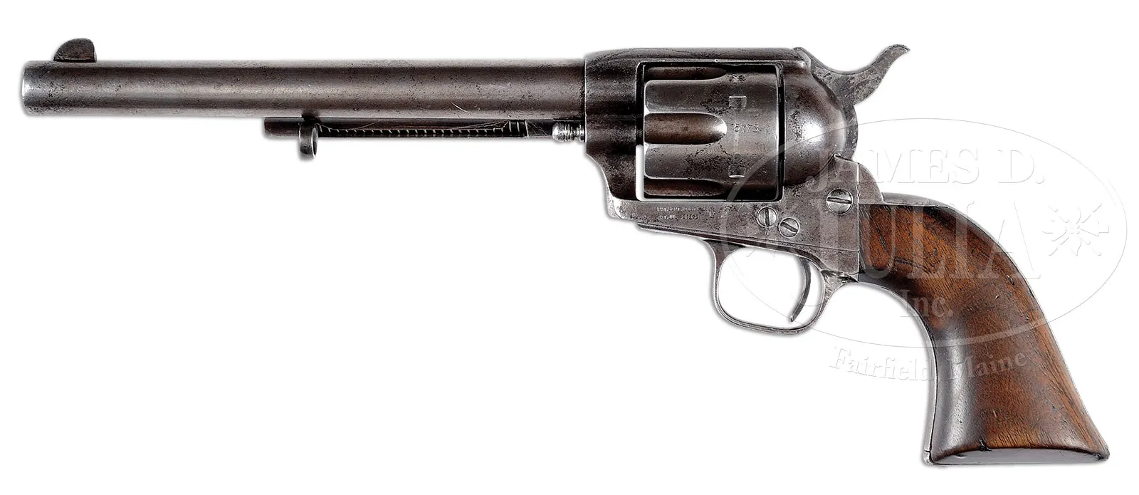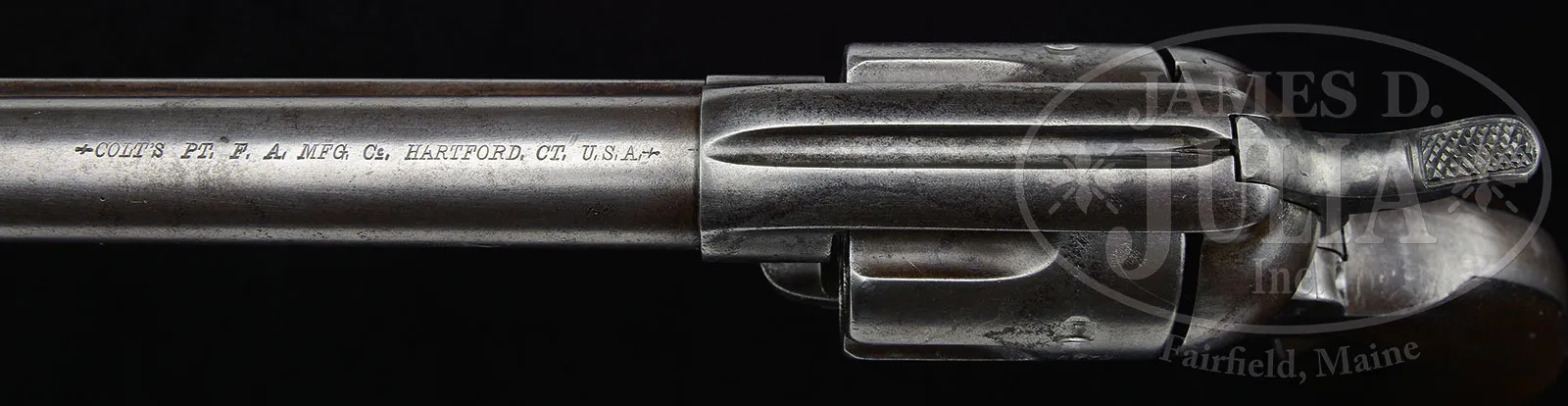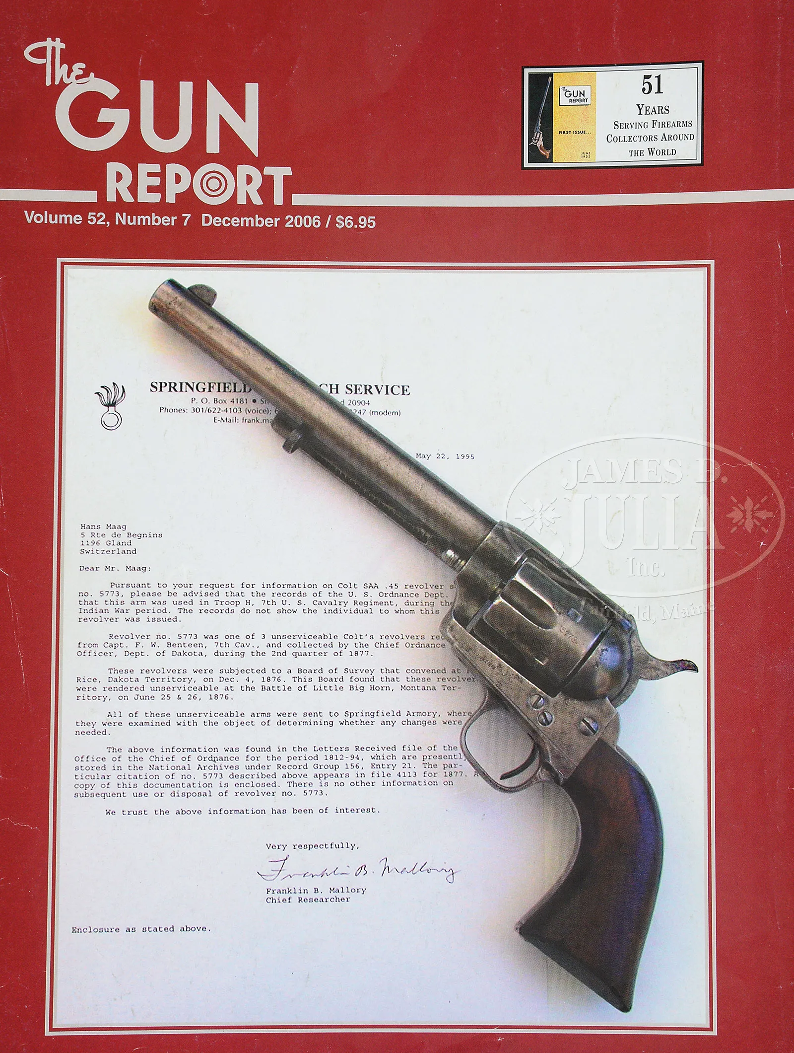 Please Note: We misspelled John Kopec’s name in the description. It is spelled Kopec NOT Kopek. COLT SINGLE ACTION ARMY SN 5773 POSITIVELY PROVEN TO HAVE BEEN USED BY ONE OF CUSTER’S MEN DURING THE INFAMOUS BATTLE OF THE LITTLE BIGHORN.SN 5773. Cal. 45 Colt. Usual configuration with 7-1/2″ bbl, full front sight and 1-line script letter address with serifs at each end. Left side of frame has 2-line September 19, 1871 and July 2, 1872 patent dates along with a small “U.S.” Mounted with 1-pc walnut grip with matching SN in the backstrap channel. Ejector housing is orig first type with bullseye ejector rod head and base pin is orig type with dimpled ends. Bottom of the bbl under the ejector housing is marked with matching SN which is also found on the cylinder. Bottom of the bbl also has a tiny “A” (Orville W Ainsworth) sub-inspector initial along with a small “P”. Mr. Ainsworth’s “A” inspector initial is also found on the trigger guard below the SN and on the cylinder which also has a tiny “P” inspector initial. Top of the backstrap also has a small “A” sub-inspector initial. The grip shows heavy wear which has obliterated the Ainsworth cartouche and bottom edge of grip is somewhat battered which also obliterated his inspector initial. Front bottom edge of the ejector housing is beveled rather than having a sharp edge as it originally left the factory. Bottom front edge of the buttstrap is also lightly beveled instead of being a sharp edge as was original on these early revolvers. This was often done at the arsenal level and in the field. The reason being that sharp edges on the ejector housing quickly wore the holsters and the sharp edge of the buttstrap was uncomfortable for the shooter. Cylinder has large, wide stop notches without approaches but shows slight battering from the lock bolt in those areas. Loading gate has the assembly number “710” which is also found on bottom of frame, under the trigger guard. A large portion of the revolver has moderate to heavy blood pitting, especially on the cylinder, recoil shield and frame. This Colt SA Army is a true historic American treasure. It is the only documented, complete and original Colt SA Army that can be proven to have been part of one of the greatest military cavalry disasters of all time. In the summer of 1876, General George Armstrong Custer together with 12 companies of approximately 800 men were on the trail of Sitting Bull and his band of Sioux followers. Custer’s command was part of a 3 prong effort to source, capture and bring back this large group that had left the reservation. Custer and his men discovered Sitting Bull’s camp on the banks of the Little Big Horn River on the 25th of June and for various reasons decided to immediately attack. Custer divided his command into 4 units; 3 of which would participate in the battle. His intention was to descend upon the Indian village with the 3 different units all attacking in pincer type movement. Custer, with 200+ men, intending to go to the far end of the village while Reno and Benteen coordinated and attacked on the other end of the village. When Custer initially planned the attack, he assumed it was a typical Indian village. What he did not know was that it was a massive gathering of Lakota, Sioux, Northern Cheyenne and Arapaho Indians consisting of literally thousands. Reno was the first to attack and was quickly repulsed and retreated to a hilltop defense position which he and his men desperately held. Eventually Benteen returned coming to their rescue and together they were able to repulse the attacks. Custer and his 5 companies, however, were not so fortunate. Upon attacking the far end of the village, he was immediately repulsed and his command, shortly thereafter, disintegrated. Eventually, the Indians overwhelmed Custer’s command. Custer, his two brothers, a nephew, his brother-in-law, together with his entire command were annihilated; not a single soul survived. A couple of days later, Benteen together with a command of troopers, visited the battle site and collected and buried all of their massacred brothers. What they observed was a grisly battlefield of naked, mutilated bodies and virtually nothing of value left. The Indians had removed the troopers’ uniforms, boots, holsters and of course their guns. With a few exceptions, the battlefield had been swept clean by the Indians. Few items that the Indians missed were either gathered or buried with the troopers. Documents found in the National Archives relate to a board of survey convened at Fort Rice, Dakota Territory on December 5th, 1876. That survey related to a group of 12 Springfield Carbines and 3 Colt SA Revolvers including SN 5743, 6559 and this gun, SN 5773. This group, as presented by Captain Benteen, in his words, were all rendered unserviceable in action against hostile Indians at the Battle of Little Bighorn, M.T. on the 25th and 26th of June, 1876. As such, these guns are the only that can be positively identified to have been utilized in the infamous battle. The documentation was made by one of Custer’s commanding officers who was present at the battle and the guns are identified by serial number, thus conclusively proving their existence at the battle. It must be remembered that after the battle, nearly all guns were swept clean of the battlefield by the Indians. Shortly after that, these Indians either disbanded and returned to the reservation or escaped to Canada. Initially, any Indian possessing one of these firearms kept its existence confidential. After all, at this crucial time in history, possession of evidence such as that would have likely rendered an immediate death sentence for any Indian possessing a U.S. Cavalry gun. So the guns identified by serial number and turned over by Benteen are not only conclusive battlefield participants but also exceedingly rare. Over the years, many guns have been identified as purportedly having been used at the battl